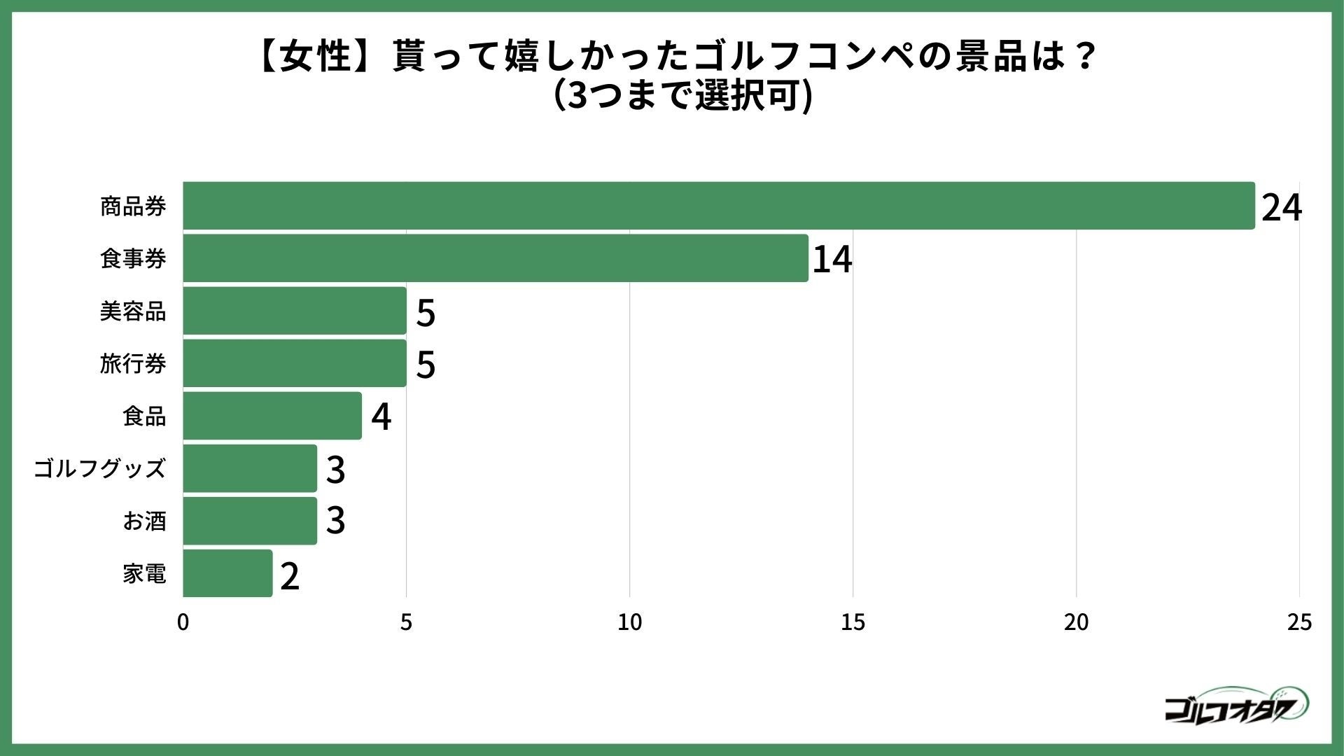 女性で貰って嬉しかったゴルフコンペの景品は「商品券」が24票で1位。2位、3位には「食事券」(14票)、「美容品」「旅行券」(5票)がランクインしました。