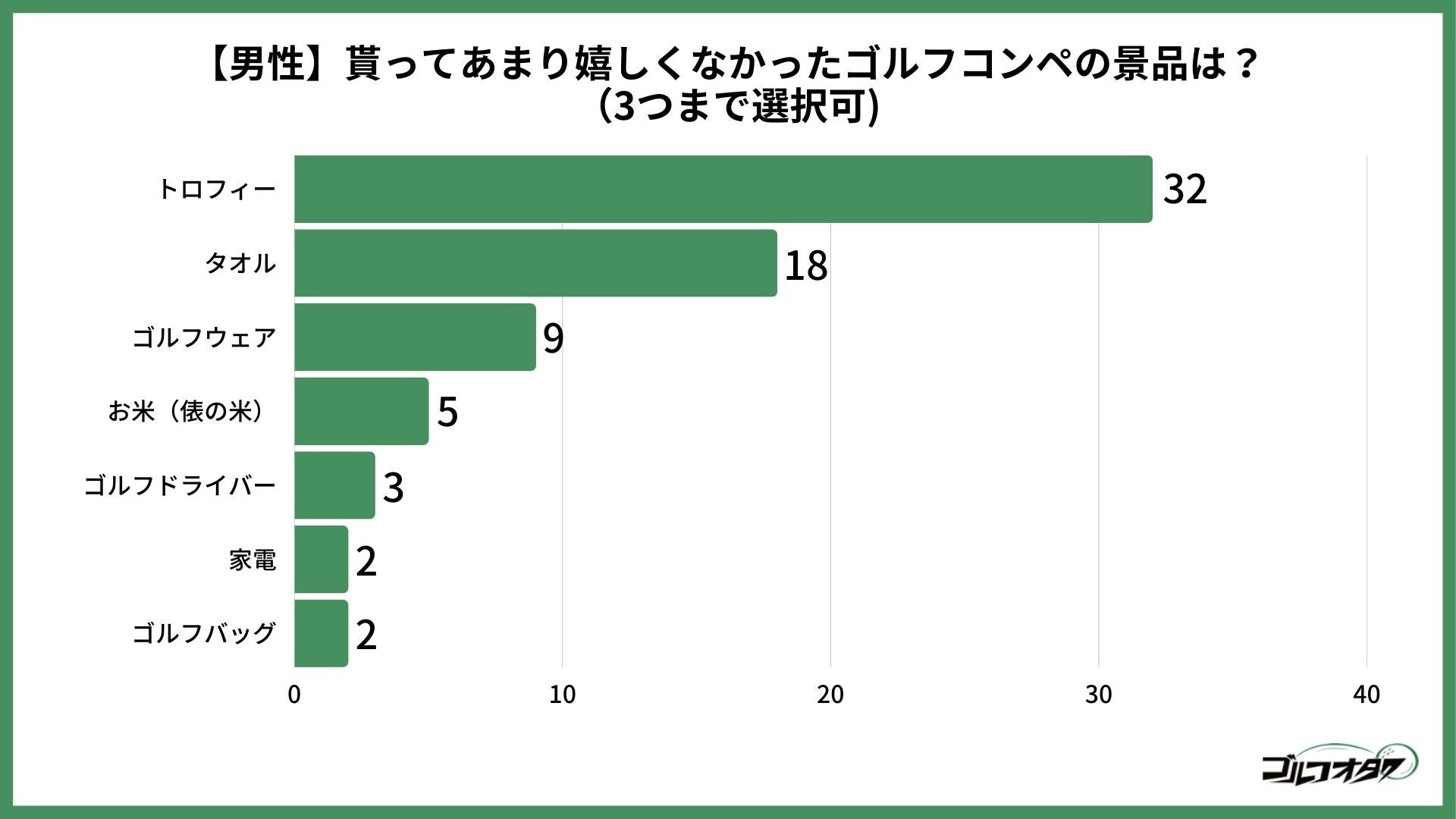 男性で貰ってあまり嬉しくなかったゴルフコンペの景品は「トロフィー」が32票で1位。2位、3位には「タオル」(18票)、「ゴルフウェア」(9票)がランクインしました。