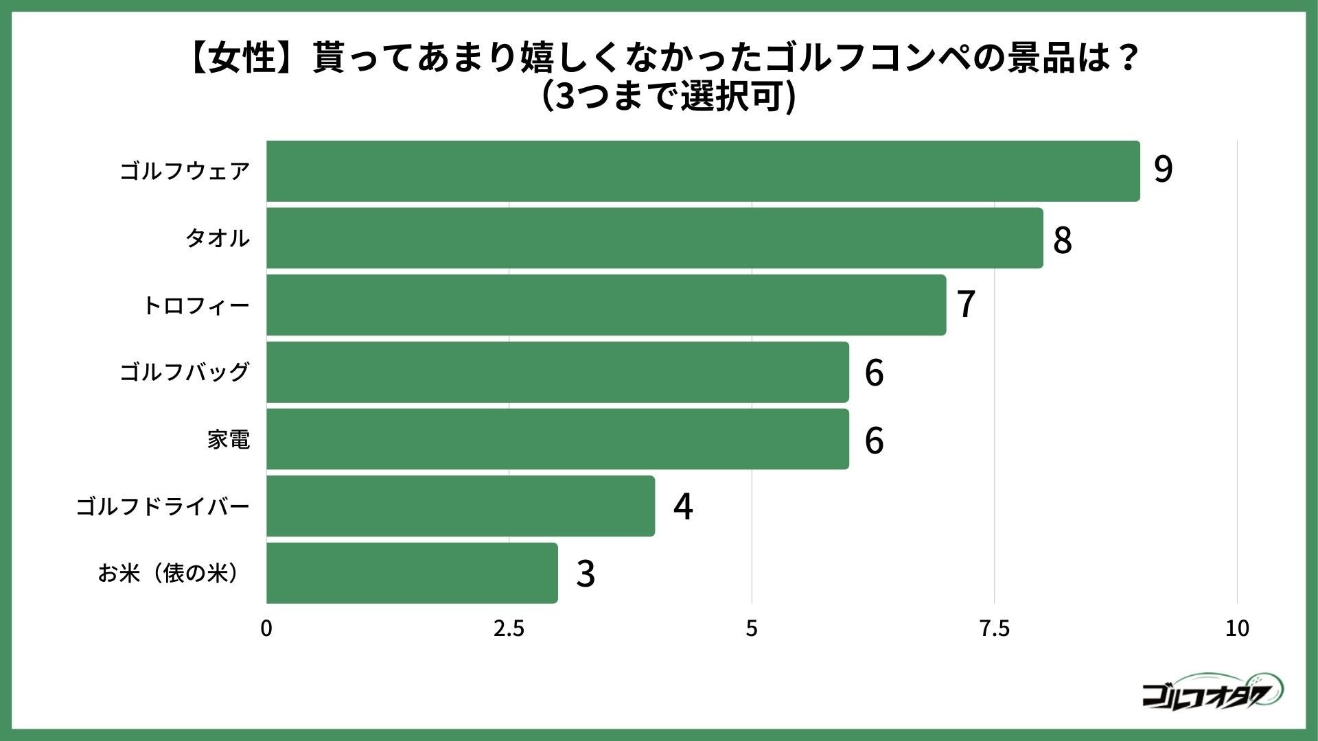 女性で貰ってあまり嬉しくなかったゴルフコンペの景品は「ゴルフウェア」が9票で1位。2位、3位には「タオル」(8票)、「トロフィー」(7票)がランクインしました。