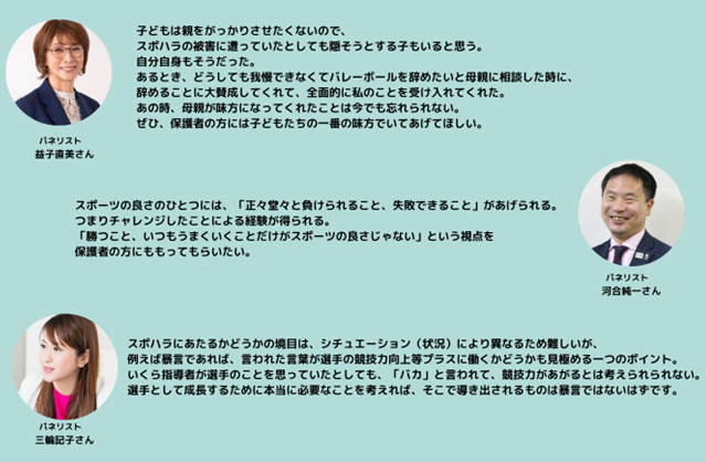 参加者からは、子どもたちを「スポハラ」から守るために保護者にできることとして、次のような声が寄せられました。