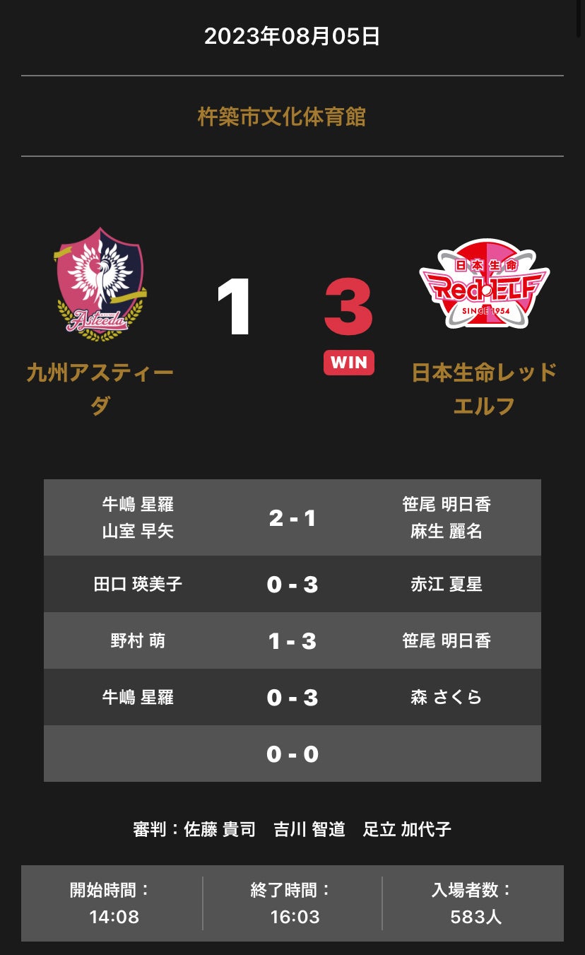 ホームプレスリリース ノジマTリーグ 2023-2024シーズン 公式戦 8月5日開催 九州アスティーダ vs 日本生命レッドエルフ 試合結果 2023年08月05日 19時07分 公開|スポーツマニア編集部プレスリリース 一般社団法人Tリーグのプレスリリース ノジマTリーグ 2023-2024シーズン 公式戦 8月5日開催 九州アスティーダ vs 日本生命レッドエルフの試合結果は1-3で日本生命レッドエルフが勝利しました。