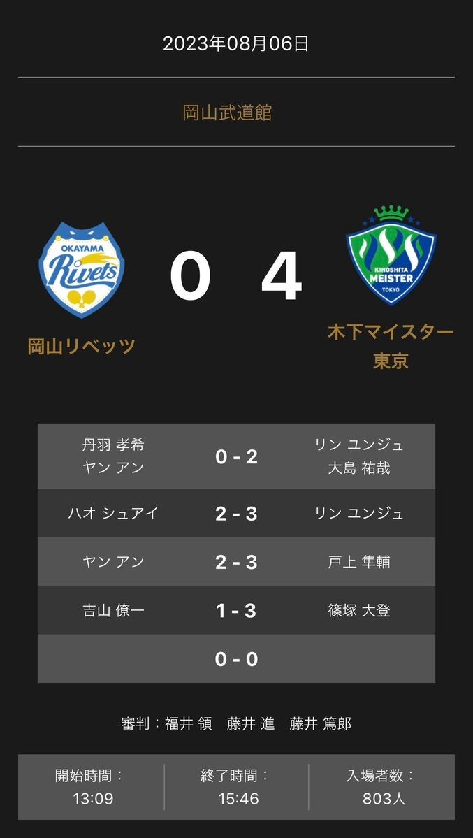 ホームプレスリリース ノジマTリーグ2023-2024シーズン公式戦 8月6日(日)開催 岡山リベッツ vs 木下マイスター東京 試合結果 2023年08月06日 17時06分 公開|スポーツマニア編集部プレスリリース 一般社団法人Tリーグのプレスリリース ノジマTリーグ2023-2024シーズン公式戦 8月6日(日)13:00試合開始、岡山武道館にて開催されました 岡山リベッツ vs 木下マイスター東京の試合は、 0-4で、木下マイスター東京が勝利いたしました。