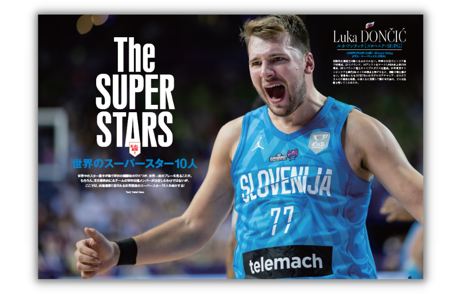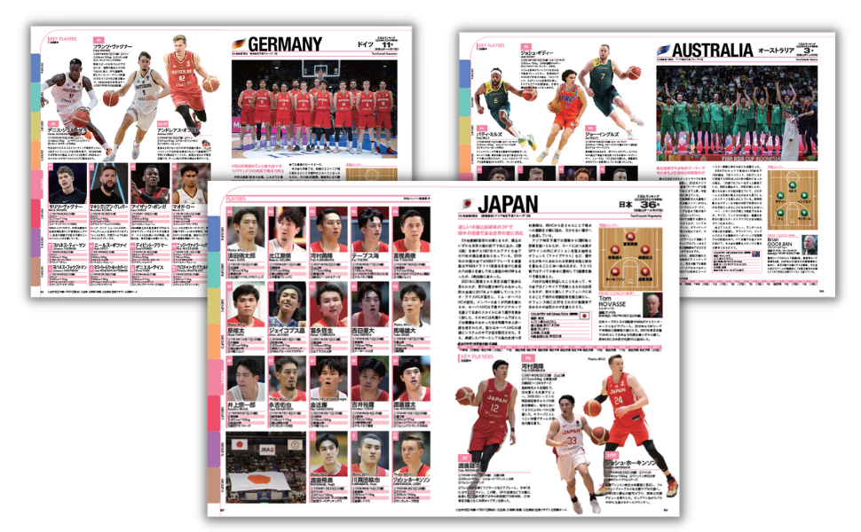対戦グループA~Hに分けて、試合日程、出場全32チームの特性や注目選手を紹介。FIBAランキングも掲載しているので、観戦に役立ちます。日本が出場するグループEも充実解説。対戦相手のドイツ、フィンランド、オーストラリアのチームの注目ポイントを紹介。チームガイド以外にも、見逃し厳禁!!世界のスーパースター10人も紹介。
