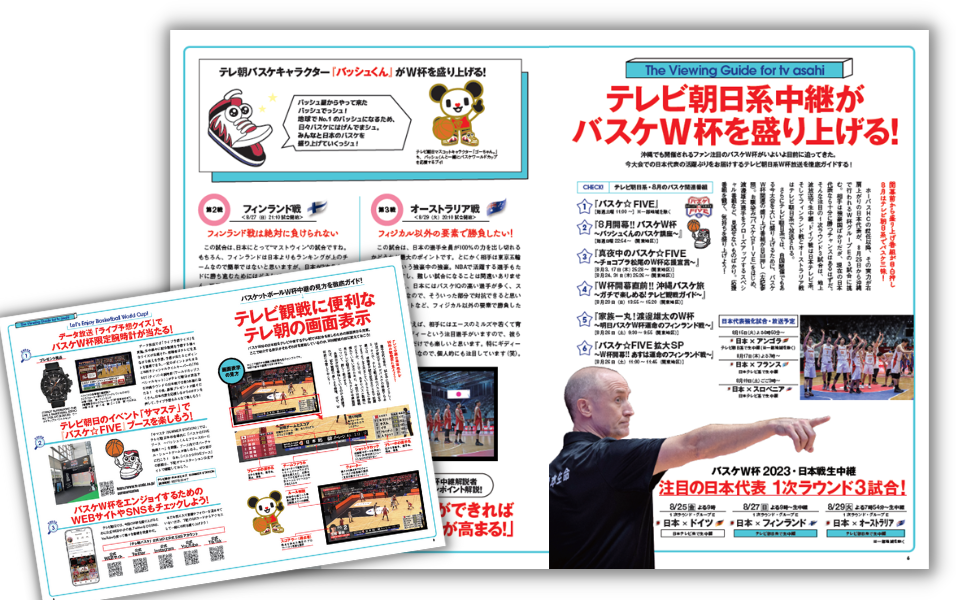 バスケW杯2023の日本戦 1次ラウンドは3試合。その中の2試合、第2戦の日本×フィンランド<8月27日(日)>、第3戦の日本×オーストラリア<8月29日(火)>は、テレビ朝日系列で生中継されます。ー※第1試合、日本×ドイツ(8月25日(金)は、日本テレビ系列で生中継― 本書では、TV観戦用に充実したテレビ朝日の画面表示の解説も。プレー中の選手名、チームファウル、クォーター、ショットクロック、ルール解説、スコアラーなど、観戦中どの表示を見ればよいかもわかります。