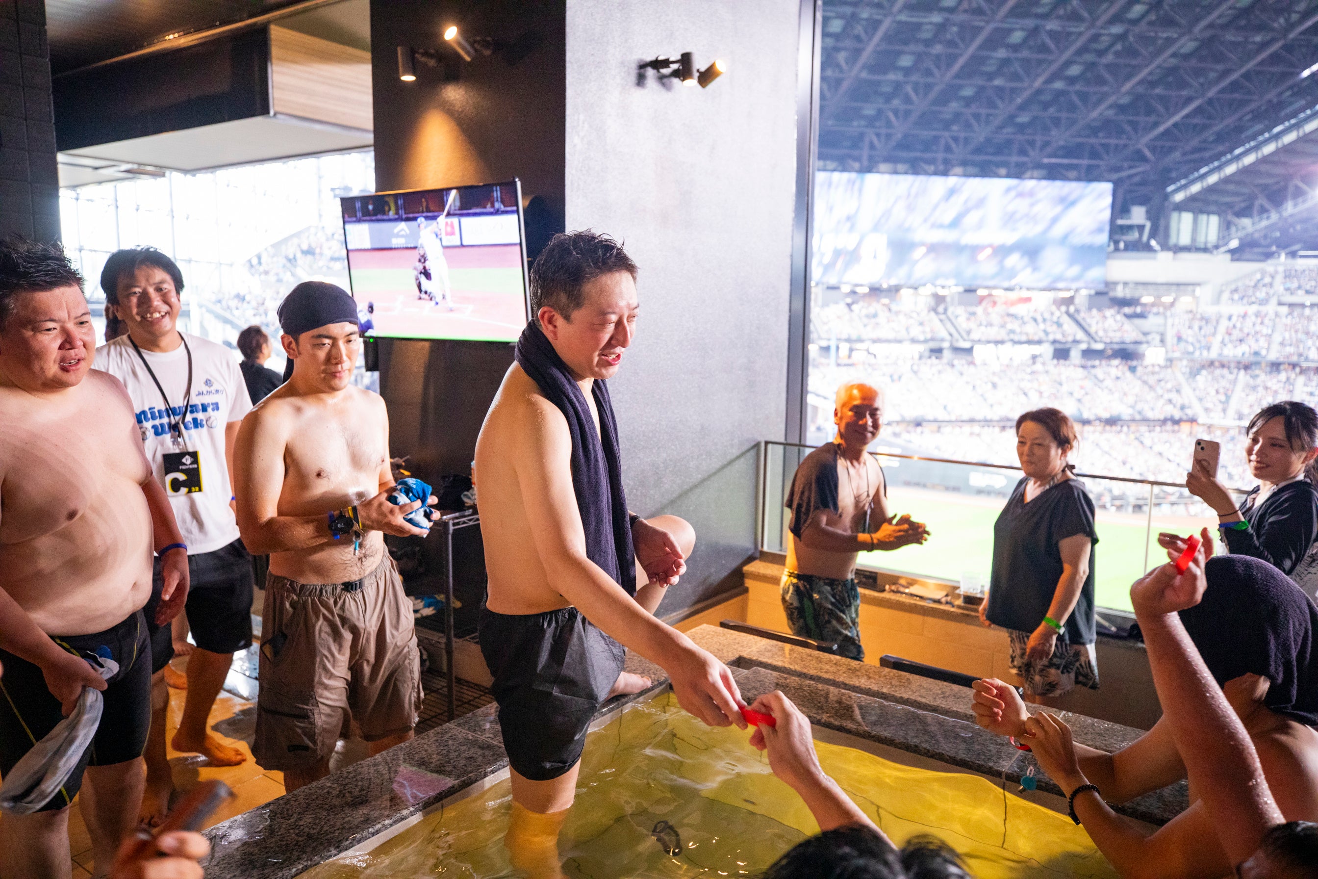 他にも「ホームラン予想!当たったら全員にドリンク1杯プレゼント」では、ファンと一緒に誰がホームランを打つか予想。「清宮、万波のいずれか」というヨミは見事的中。1回裏に清宮選手がライトスタンドにアーチを描くとサウナと温泉を楽しんでいた全員が水着姿で大盛り上がり。他にも「イニングカメラに写ろう」「ファイターズ〇×クイズ大会」といったイベントも順次開催。イベント終了後には隣接しているバースペースで記念撮影のサービスも行われました。