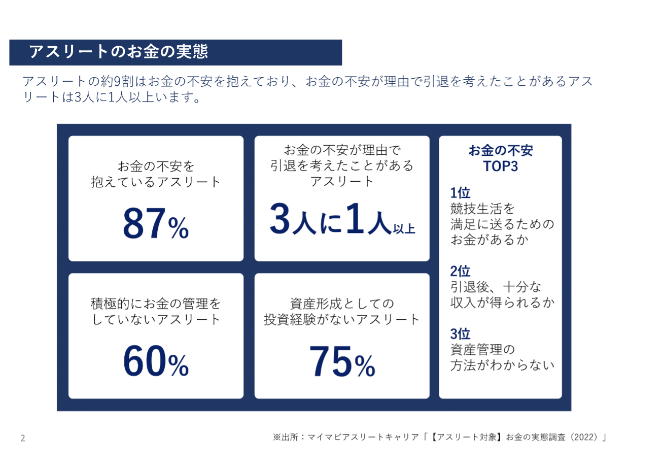 アスリートは、競技によっては現役生活が短く、収入も毎年大きく変動します。さらに、引退後のセカンドキャリアに備えるための資金計画も必要となるため、アスリートは一般の社会人に比べて、資産管理や資産運用が重要です。約9割のアスリートがお金の不安を抱えており、実際にJAMが担当しているアスリートからも「将来の資産形成に不安があるが、何をすべきかかわからない」「引退してもお金の心配をしないで、安心して暮らせるようにしたい」という声が多く寄せられます。そのため、アスリートがお金のことを気にせずに、充実した競技生活を送るため、資産管理をサポートするお金のアドバイザー必要であると考え、「アスマネ」を開設いたしました。