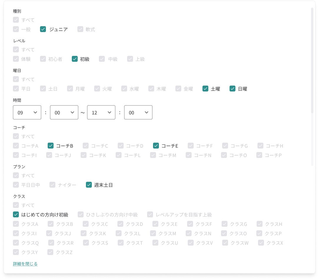 さらに、スケジュールページに移動することなく、レベルや曜日などの絞り込みも可能です。