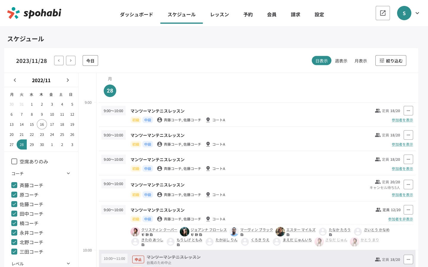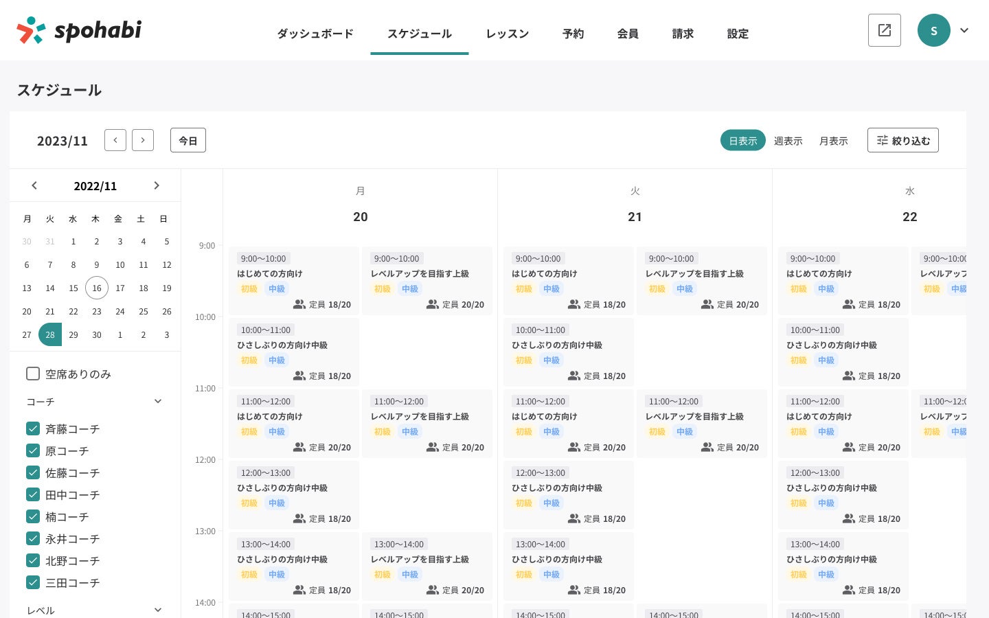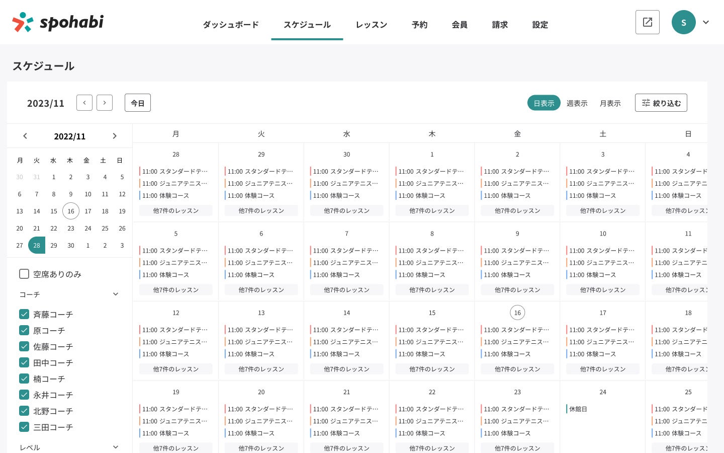さらに、表⽰のフィルター機能を追加し、コーチ・レベル・コート・空席などで絞り込め、対応する業務に必要なものだけを選択して表⽰することができるようになりました。