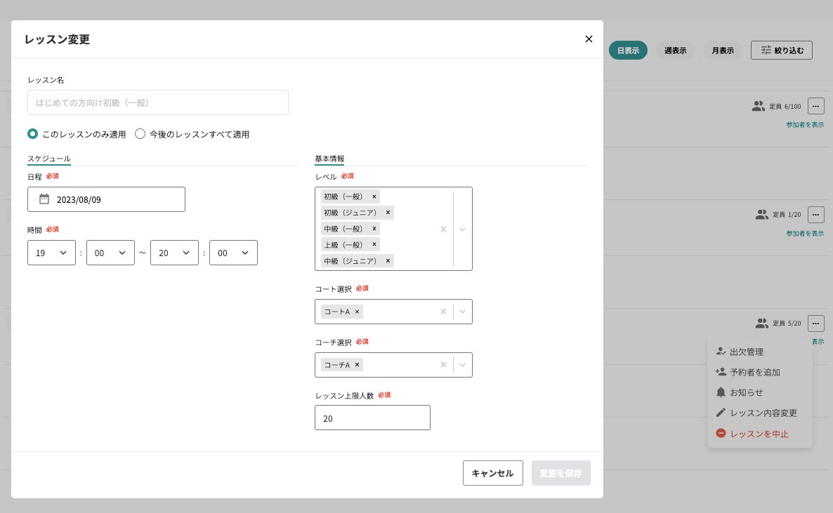 スケジュール機能のカレンダー画面から簡単にレッスン内容の変更も行えるようになりました。