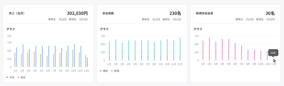 ダッシュボード機能では、スクールの情報を基に、当月の売上・本会員数・新規休会会員をグラフ化して表示することが可能です。