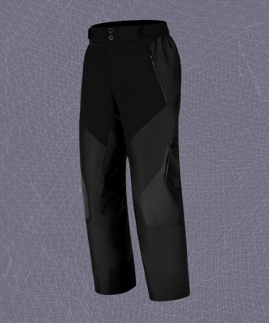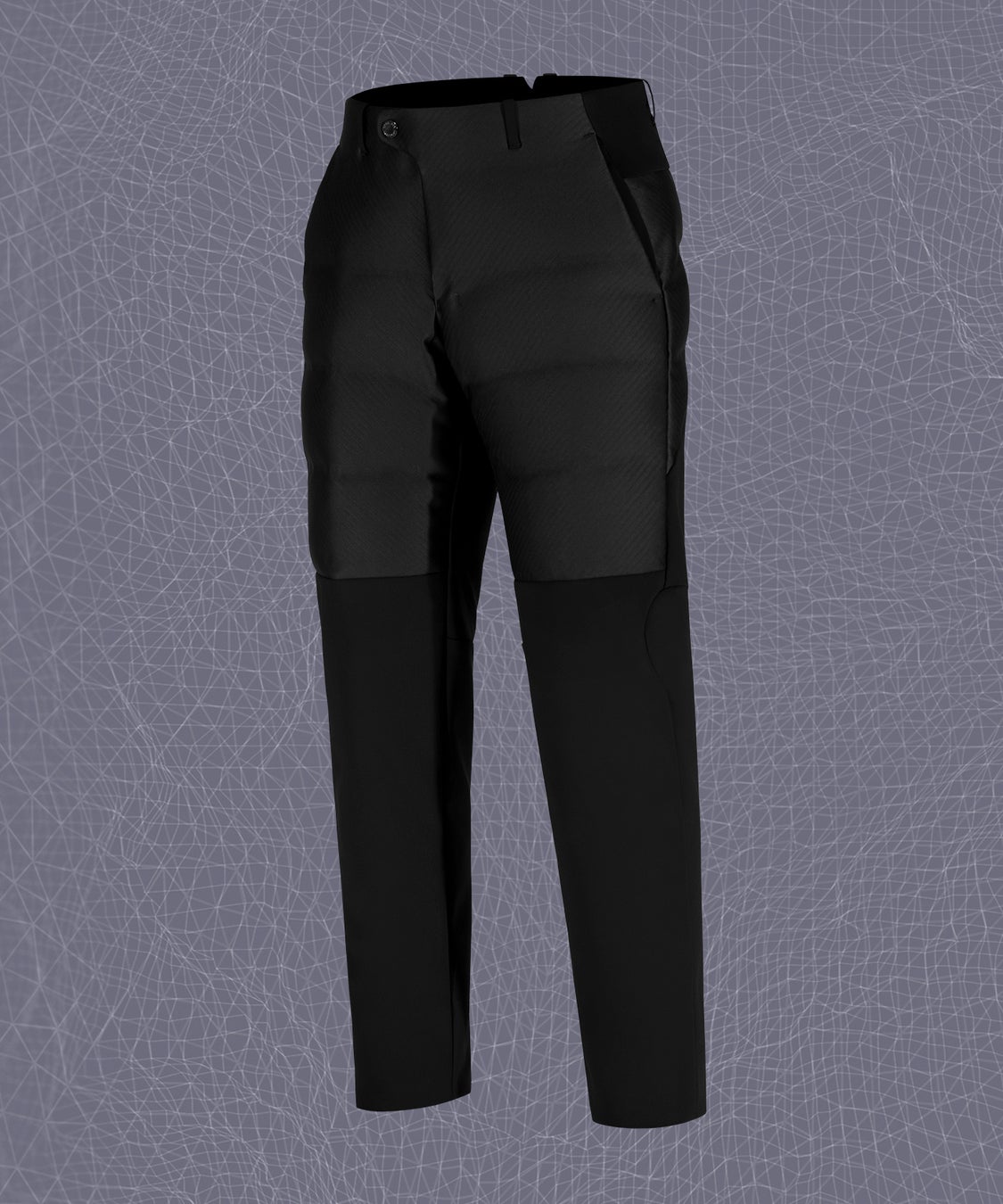ジャケットと同様に、「Schematech®」生地とダウン、ストレッチ性を兼ね備えたナイロンボンディング素材を使用し、ゴルフの動作に合わせて使い分けた設計をしています。膝にはパターン技術”アークカット”を採用し、膝の曲げ伸ばしの負担を軽減させます。腰部分には、ゴルフのプレー中にシャツがずれることがないよう防滑性素材を使用しています。