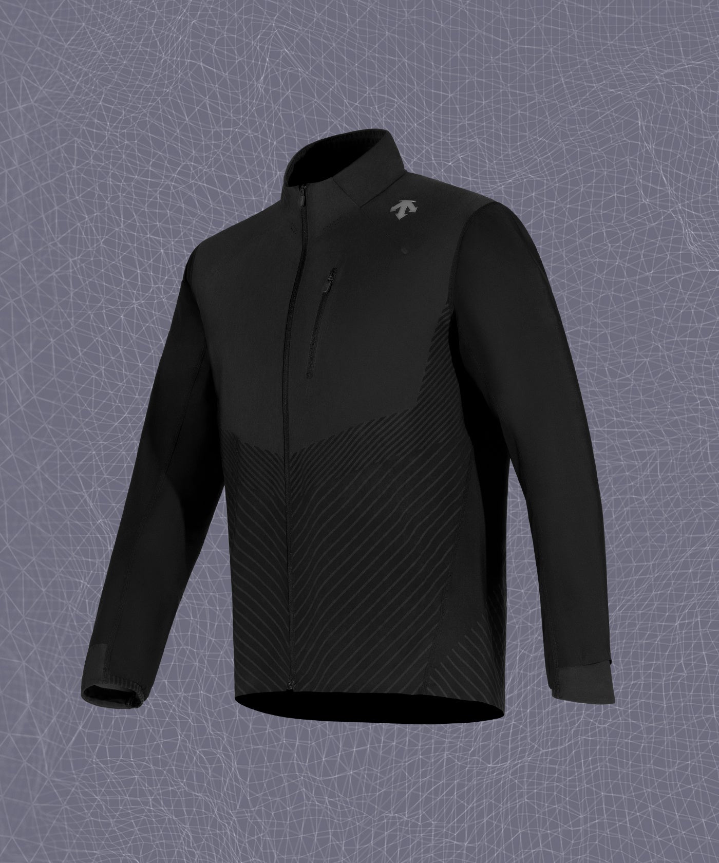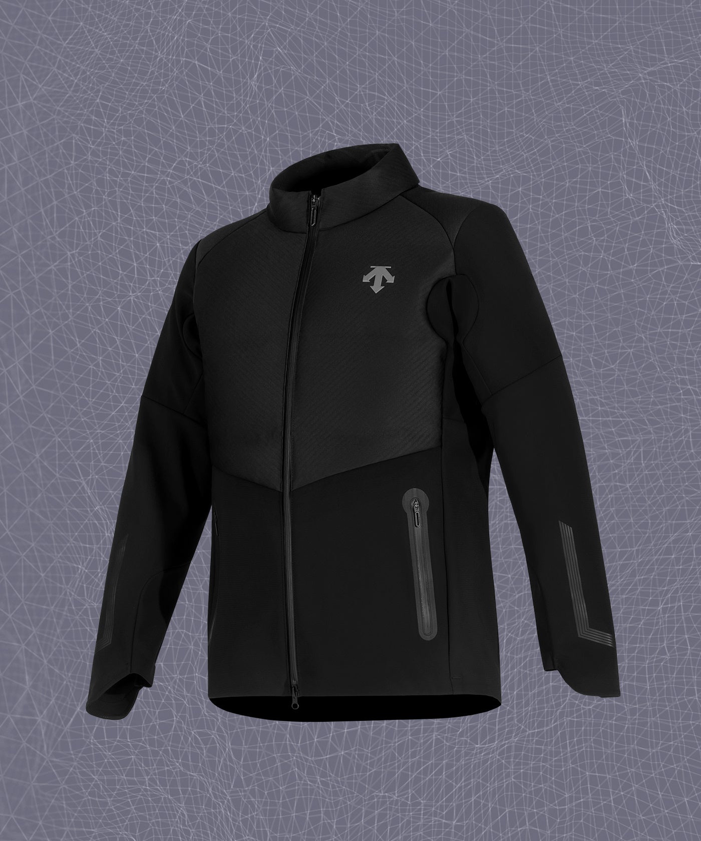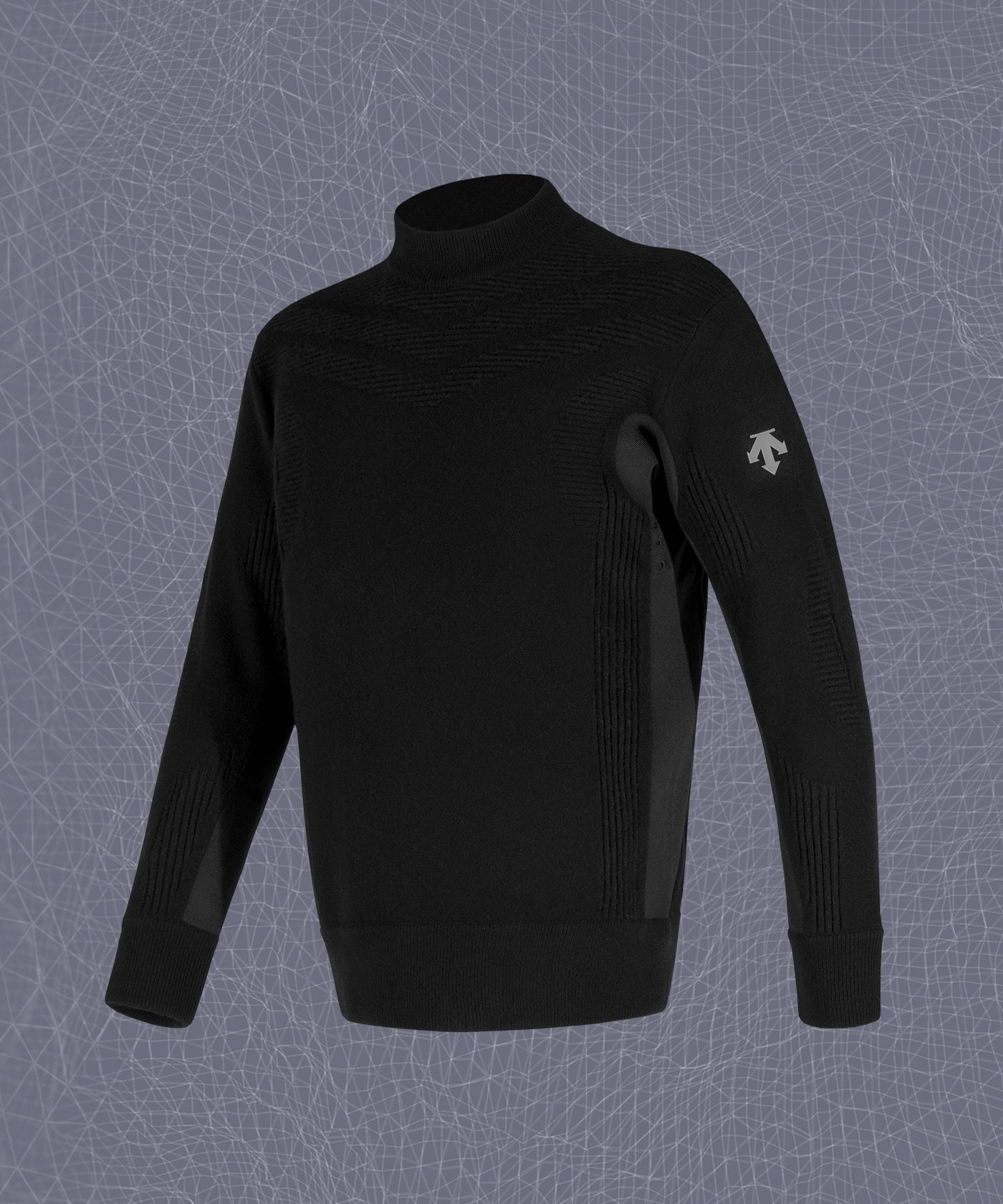 風や雨など様々な自然界の環境においても持続的にトレーニングに集中できるように、トレーニングウェアとして初めて「Schematech®」を生地に採用し、部位ごとに機能を変化させています。冷風への対策を考慮した生地を使用しながら、独自に研究した”スウェットマッピング”理論から割り出した汗をかきやすい部分や、身体を大きく動かす箇所は、特殊な融解技術を使用し生地を溶かすことで、通気性や伸縮性、軽量化をもたらしています。細部にまで施されたミニマルな機能美には、常に新たな驚きを与え続けたいという『デサント』の想いが詰まっています。