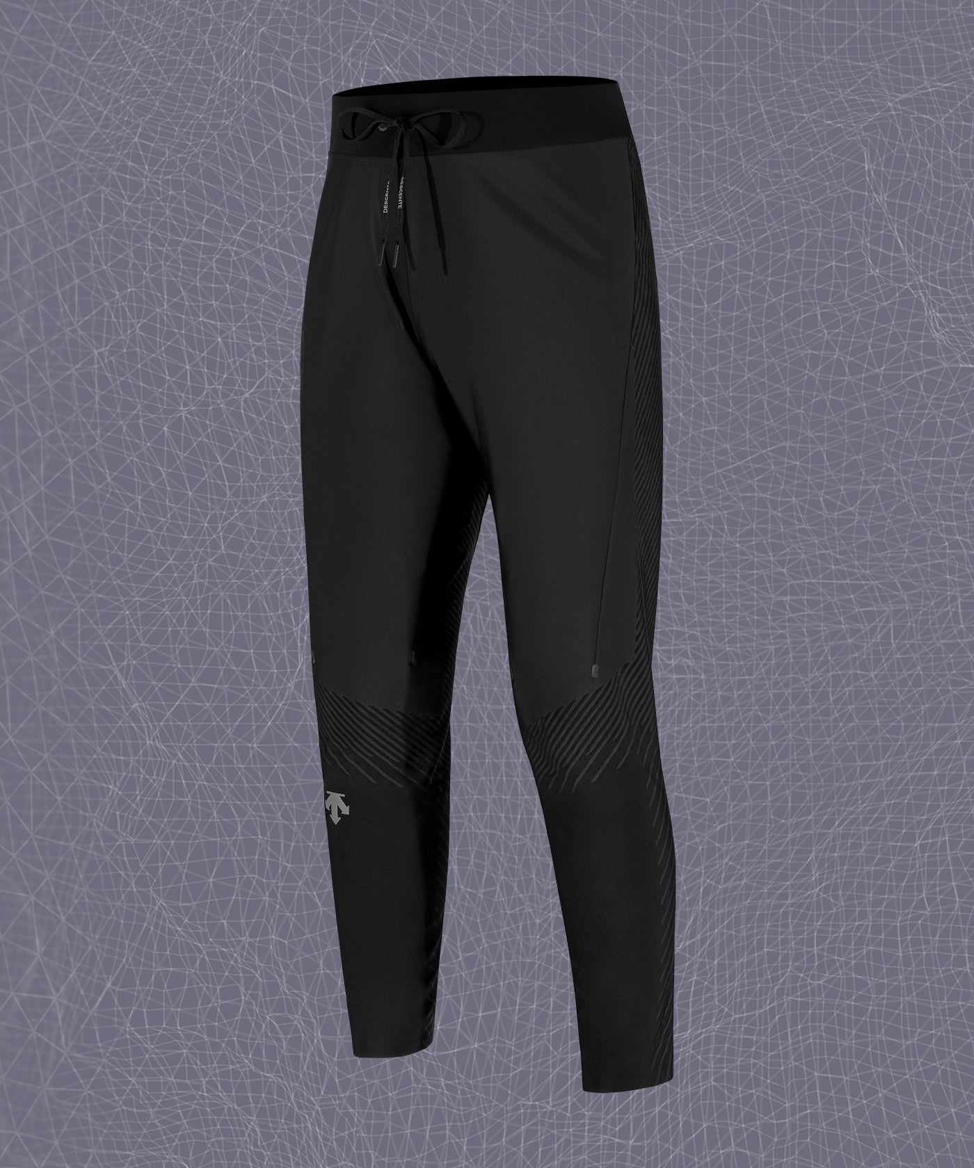 特徴:ジャケットと同様の動きやすさや機能性を持たせながら、寒さを感じやすいパンツ前面の大腿部は風を通しにくく、膝下からは足の運び方をよりスムーズにするために伸縮性を高める加工、パンツ後面は汗がたまりやすい膝裏を中心に通気性を高める加工を施しています。またパンツ特有の機能として、シューズが引っかからないように両裾にはトライアングル状のカッティングなどの機能的な仕様も付加しています。
