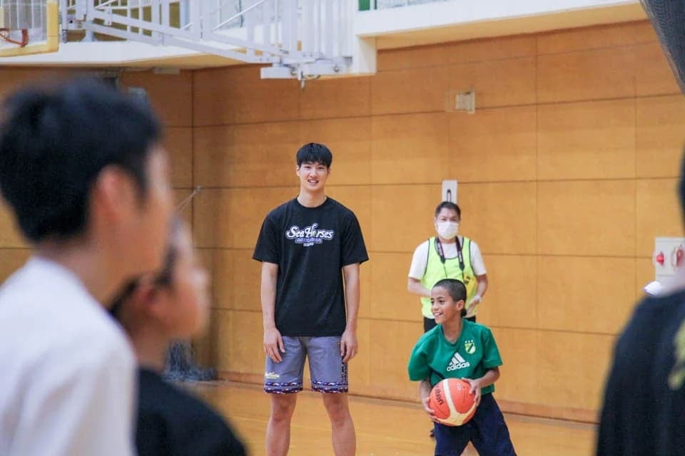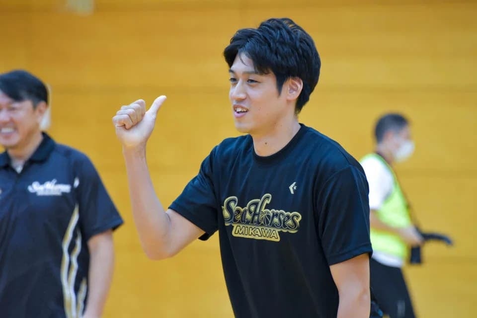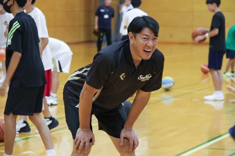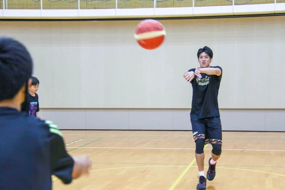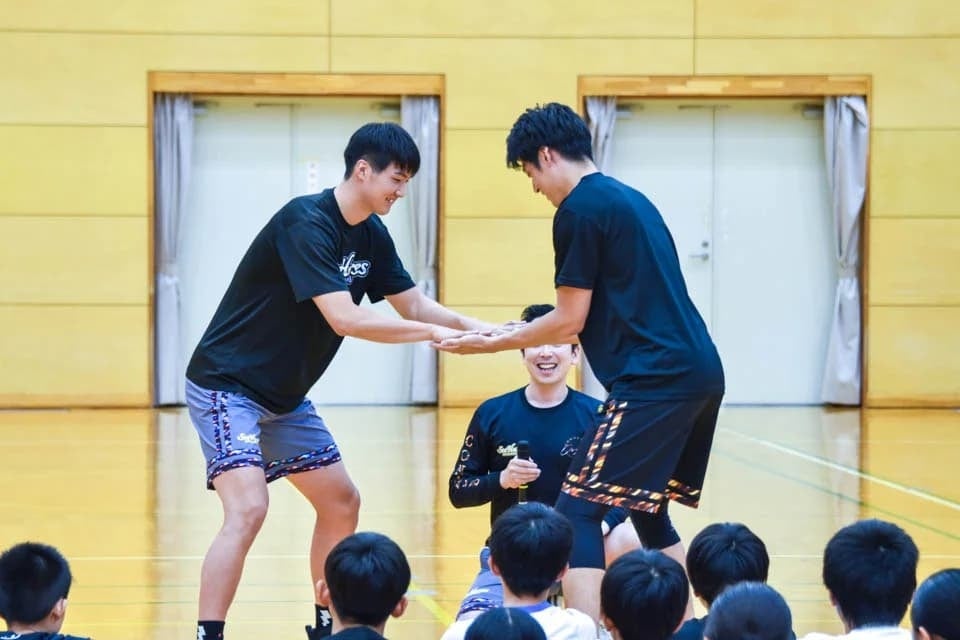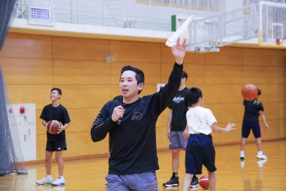 7月29日(土)、西尾市中央体育館にて、アイシン機工株式会社主催「バスケットボール教室」を開催し、#1 中村太地選手、#24 卜部兼慎選手、大久保愛樹アシスタントコーチ、佐古賢一シニアプロデューサーが参加いたしました。