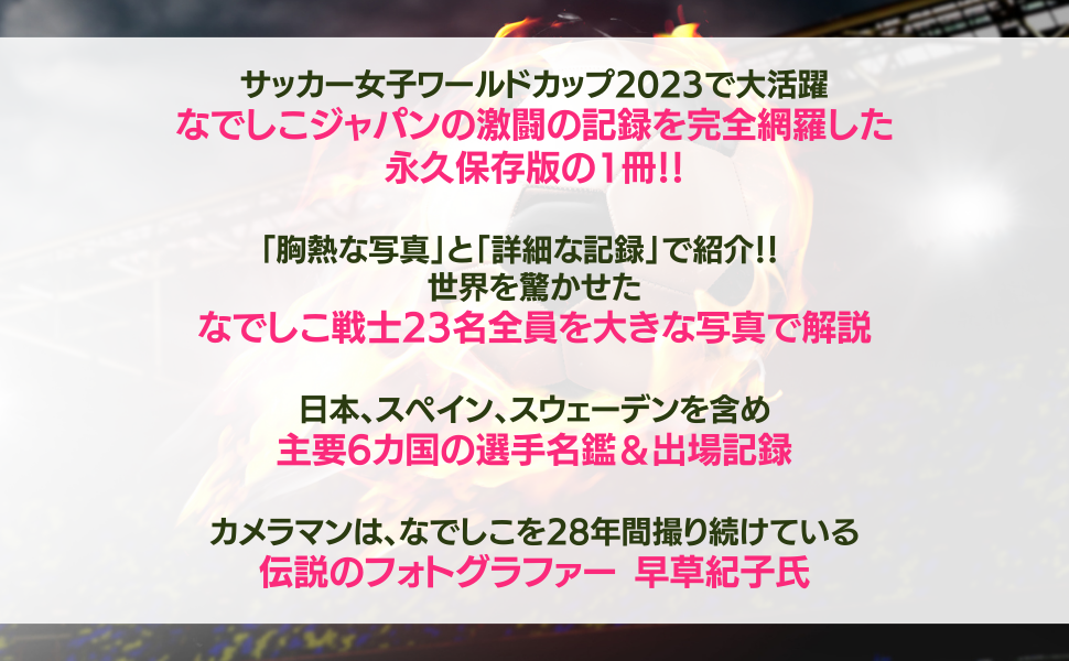 FIFA 女子ワールドカップベスト8に進み快進撃を続ける、なでしこジャパン!世界中から「今大会のダークホース」として注目を集めている。その強さの秘訣とは!? 本書では、彼女らのW杯の激闘の記録を全て網羅し「胸熱な写真」と「詳細な記録」で完全保存版の1冊を緊急発売します。カメラマンは、女子サッカーの黎明期から28年間撮り続けている伝説のフォトグラファー早草紀子氏。また、日本、スペイン、スウェーデンを含め主要6カ国の選手名鑑&出場記録も収録。なでしこ戦士23名全員を、大きな写真と解説付きで紹介します。