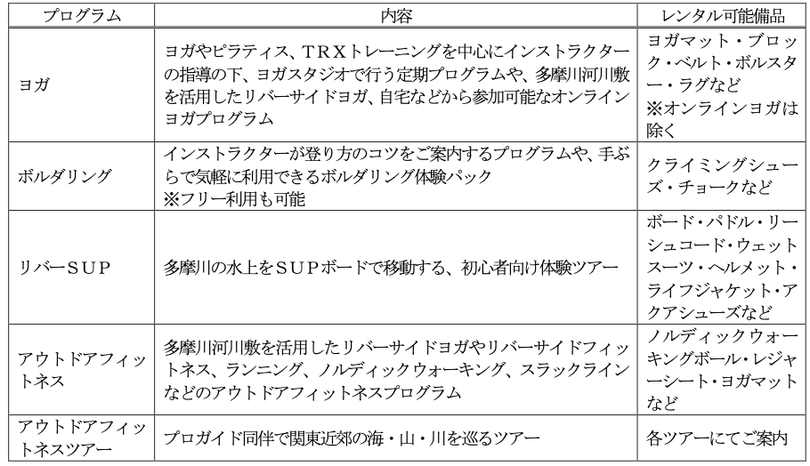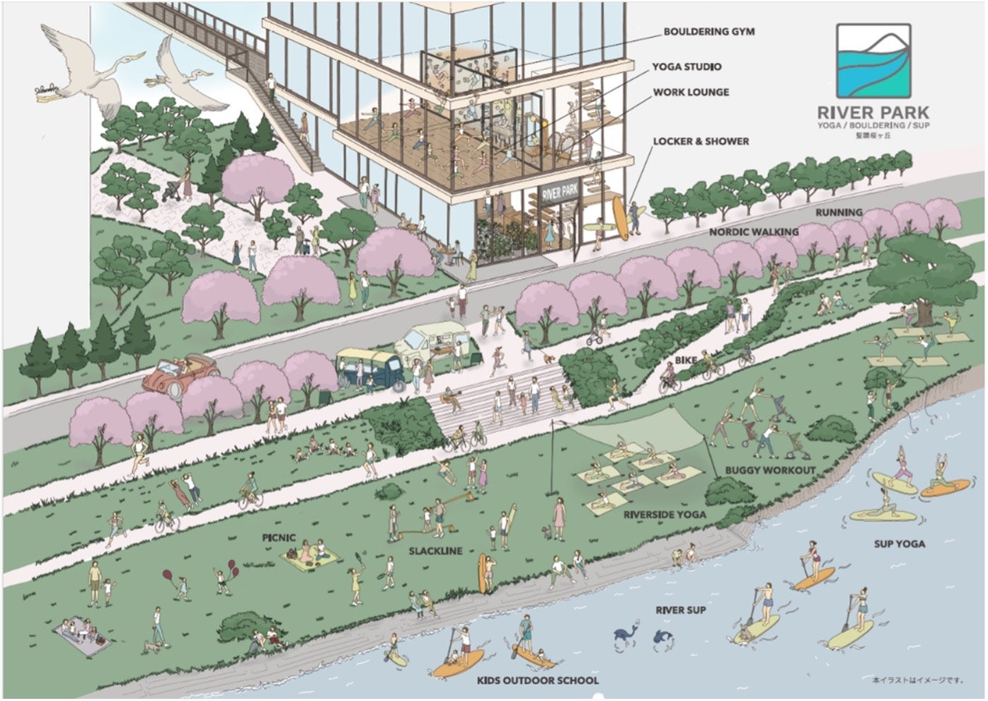 「RIVER PARK 聖蹟桜ヶ丘」は、ヨガやボルダリング、TRXトレーニング(注)などのインドアプログラムに加え、リバーSUPやリバーサイドヨガなど、多摩川の自然資源を活用したアウトドアプログラムを専門のインストラクターの下で楽しむことができる会員制のアウトドアフィットネスクラブです。