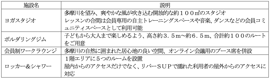 本施設内には、多摩川を望む圧倒的な解放感があるヨガスタジオや様々な熟練度の方に対応したボルダリングジムを設置します。また、施設内外から素早くアクセスできて、且つランニングステーションとしても利用できるロッカー&シャワーのほか、仕事や読書、会員間のコミュニケーションなどにご利用いただける会員制ワークラウンジを併設します。
