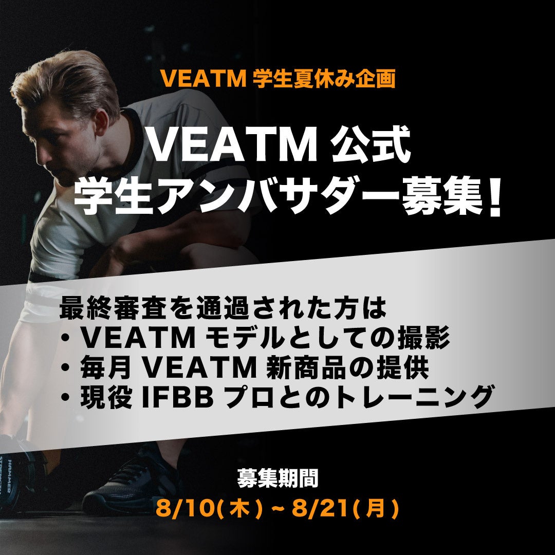 また、最終選考まで選ばれた方には、VEATMから毎月の新作商品提供、VEATMモデルとしての撮影、現役IFBBプロとのトレーニング体験等、様々なプレゼントを用意しております。VEATM公式学生アンバサダーに寄り添い支援させていただきます。