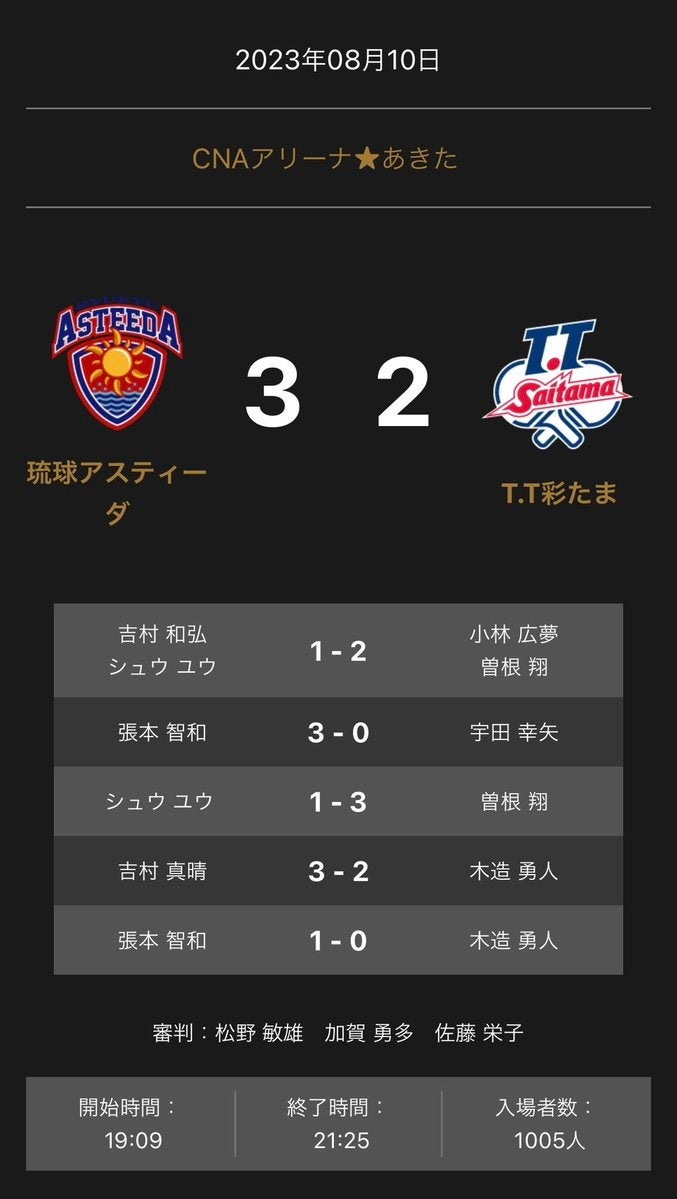 ホームプレスリリース ノジマTリーグ2023-2024シーズン公式戦 8月10日(木)開催 琉球アスティーダ vs T.T彩たま 試合結果 2023年08月10日 23時06分 公開|スポーツマニア編集部プレスリリース 一般社団法人Tリーグのプレスリリース ノジマTリーグ2023-2024シーズン公式戦 8月10日(木)19:00試合開始 CNAアリーナ☆あきたにて開催の 琉球アスティーダ vs T.T彩たま 試合結果をご報告いたします。