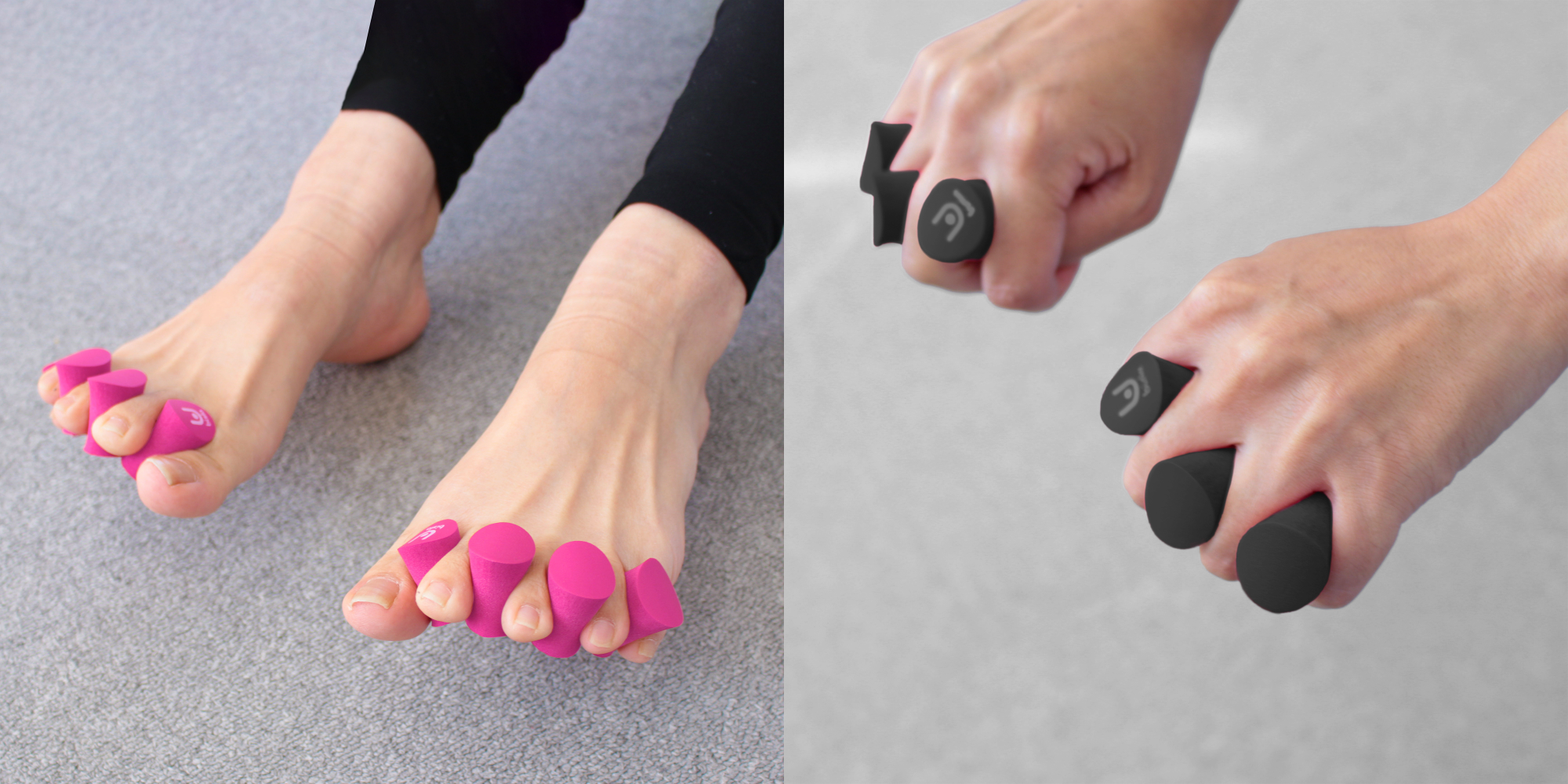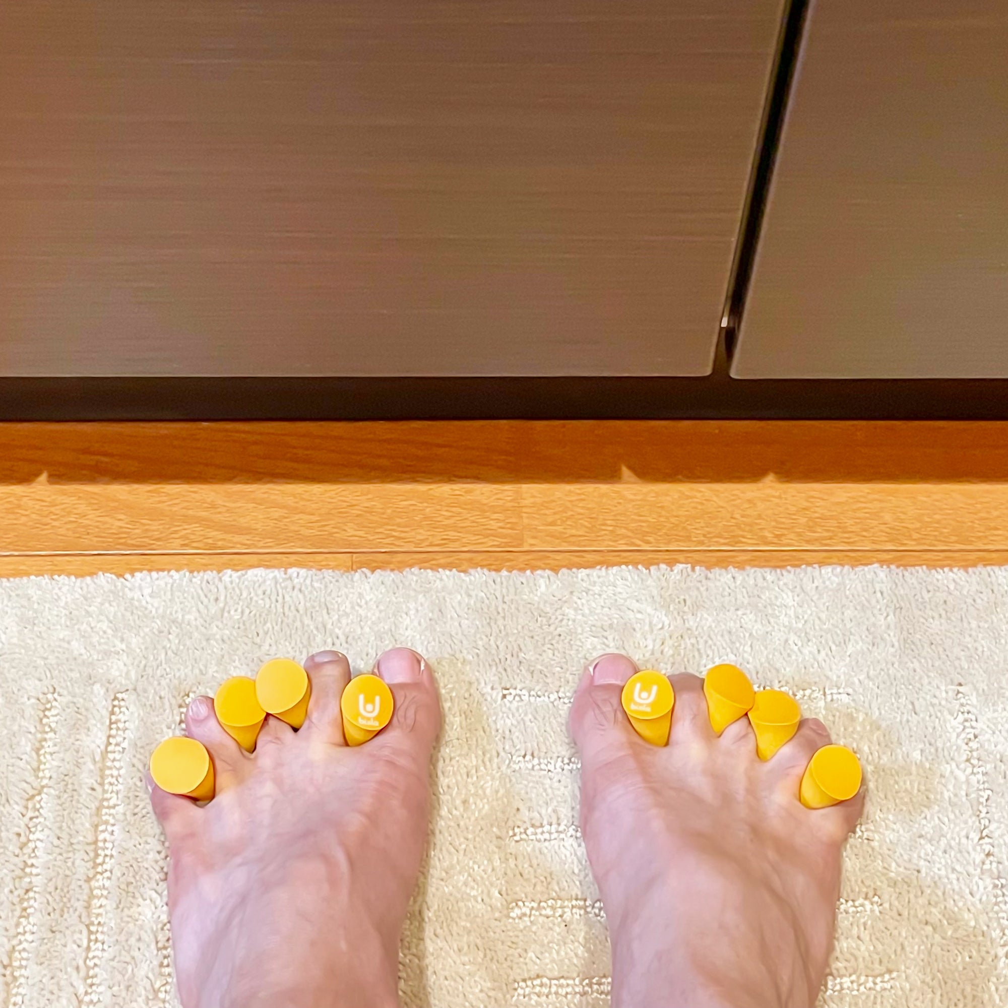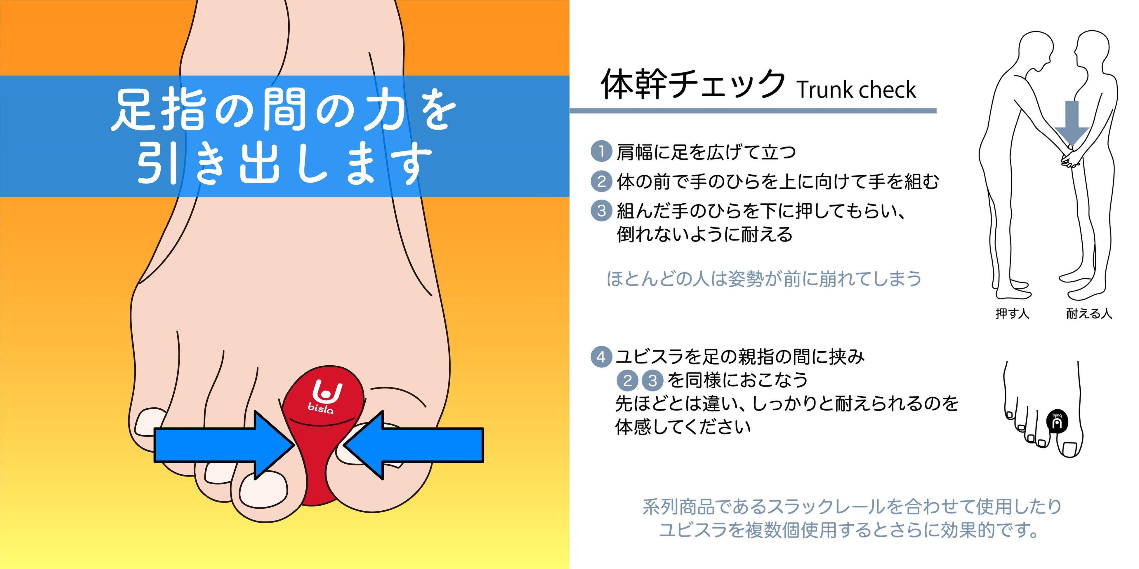 ユビスラを足指に挟み、足指の力を引き出しましょう。体幹チェックで体感できますのでお試しください。