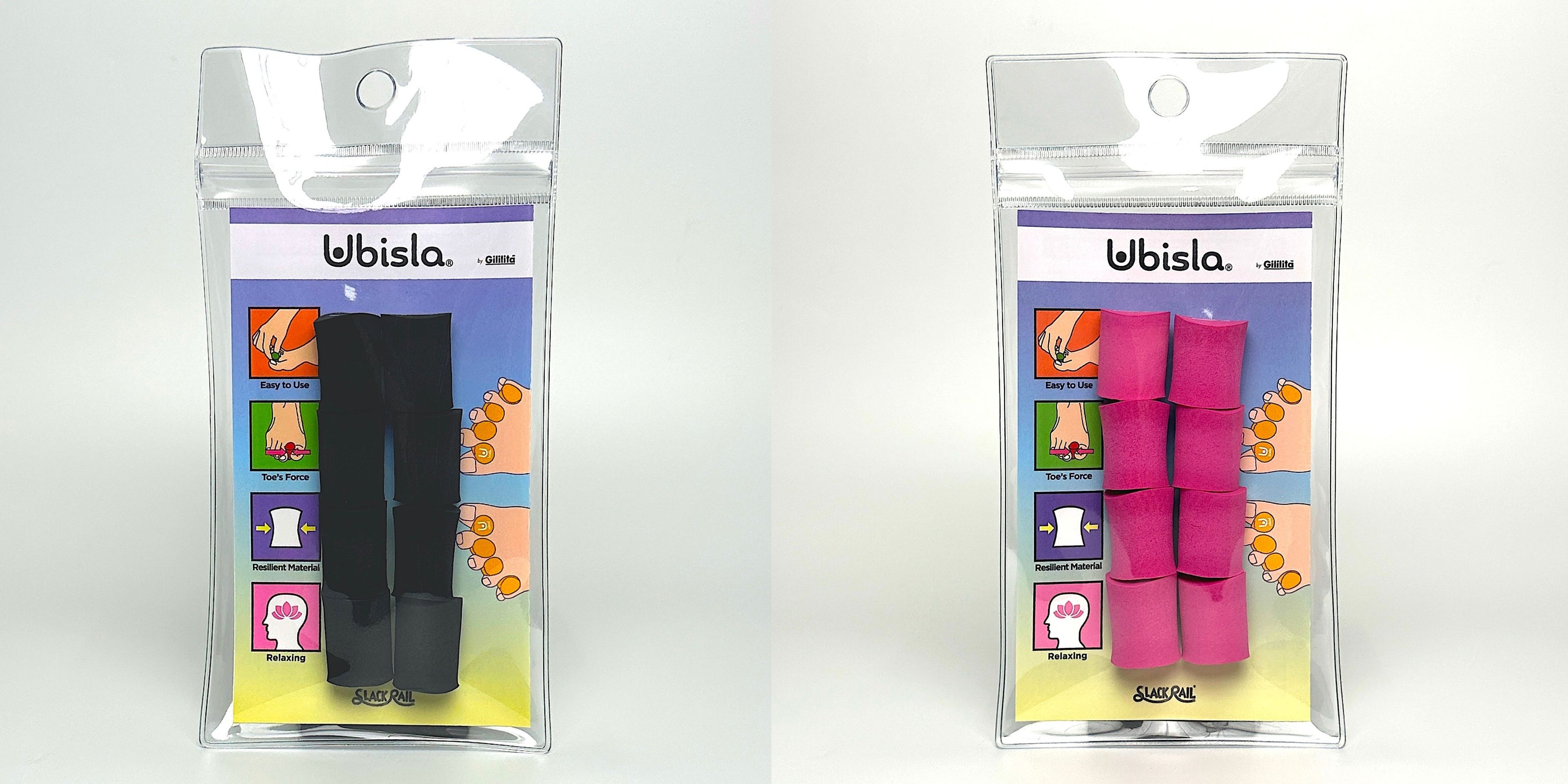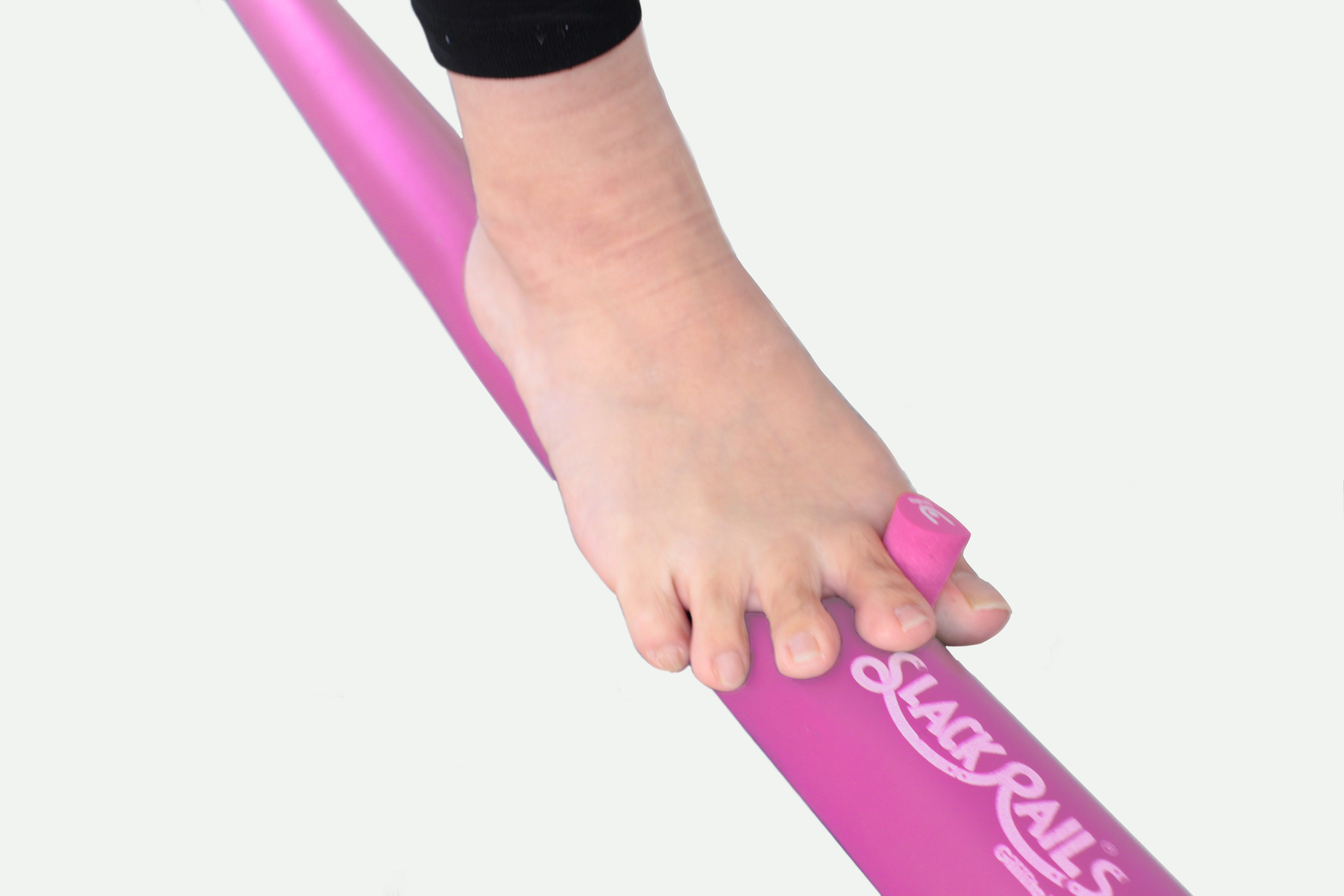 足指にユビスラを挟んだ状態でスラックレール(別売り)に乗るなど、併用して使うとよりトレーニング効果があります。