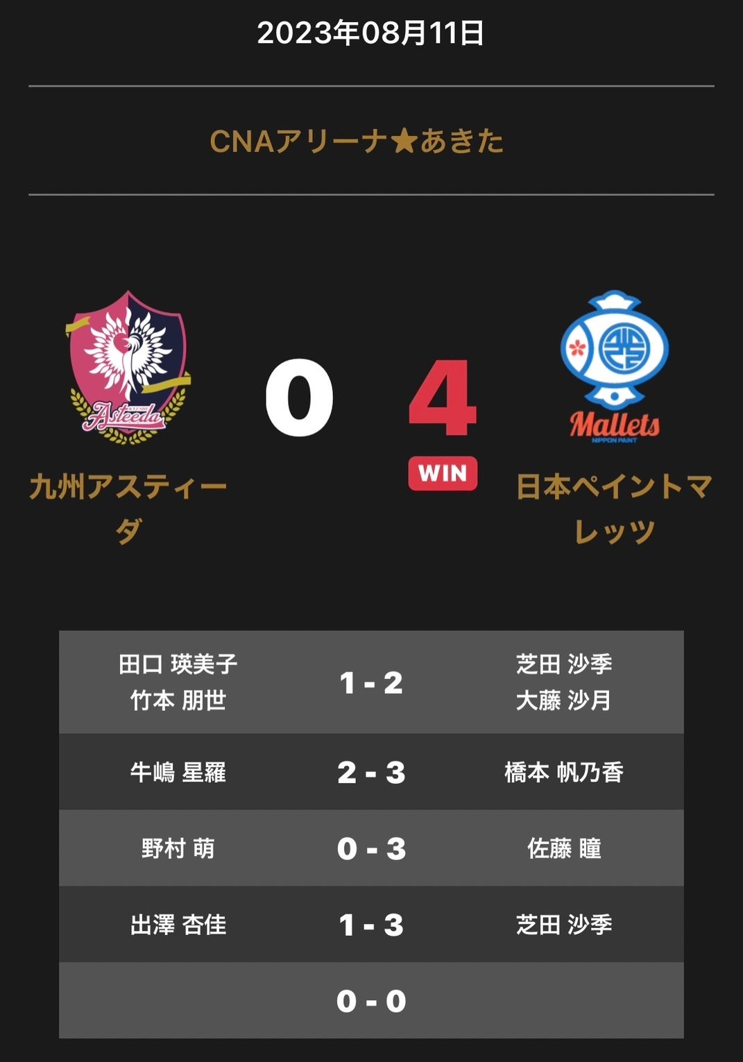ホームプレスリリース ノジマTリーグ2023-2024シーズン公式戦 8月11日(金)18:00試合開始 九州アスティーダ vs 日本ペイントマレッツ 試合結果 2023年08月11日 23時07分 公開|スポーツマニア編集部プレスリリース 一般社団法人Tリーグのプレスリリース 九州アスティーダ と 日本ペイントマレッツの試合は 0-4で日本ペイントマレッツが勝利しました。