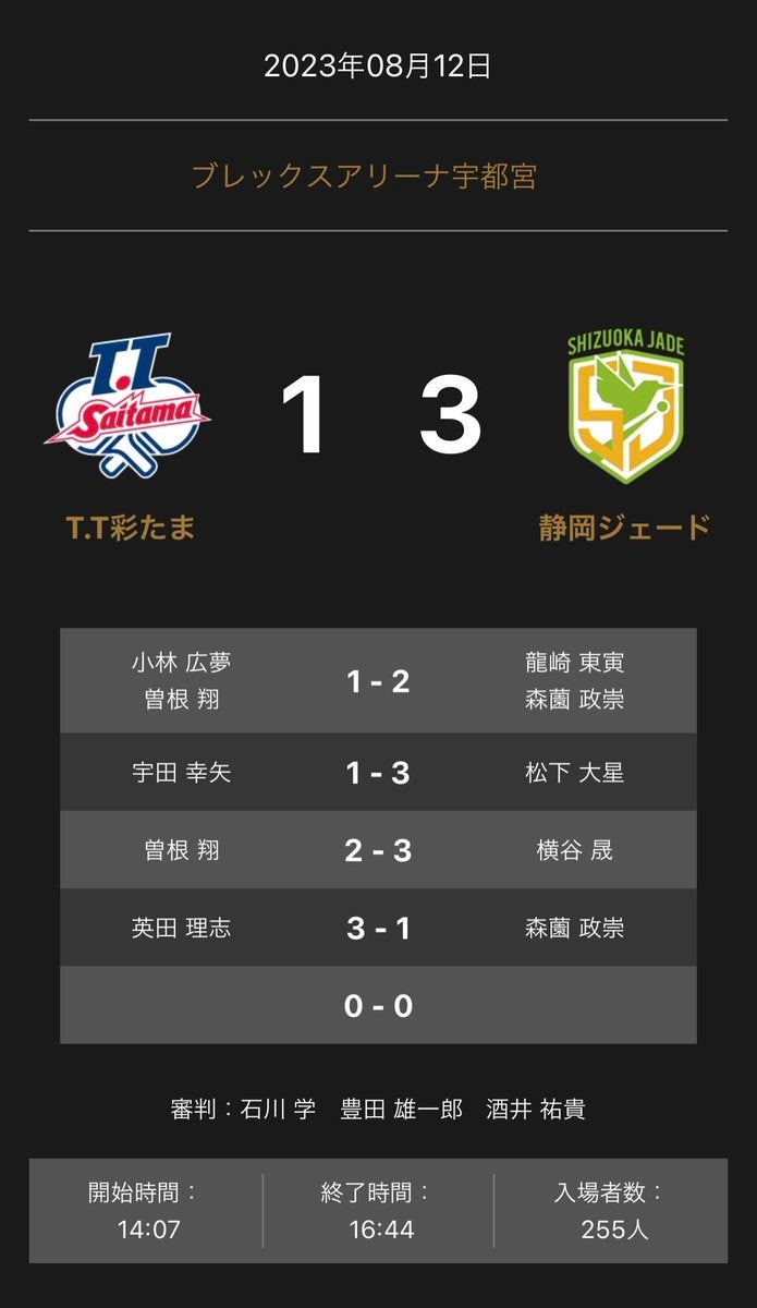 ホームプレスリリース ノジマTリーグ2023-2024シーズン公式戦 8月12日(土)開催 T.T彩たま vs 静岡ジェード 試合結果 2023年08月12日 17時06分 公開|スポーツマニア編集部プレスリリース 一般社団法人Tリーグのプレスリリース ノジマTリーグ2023-2024シーズン公式戦 8月12日(土)14:00試合開始 ブレックスアリーナ宇都宮にて開催されました T.T彩たま vs 静岡ジェードの試合結果をご報告いたします。