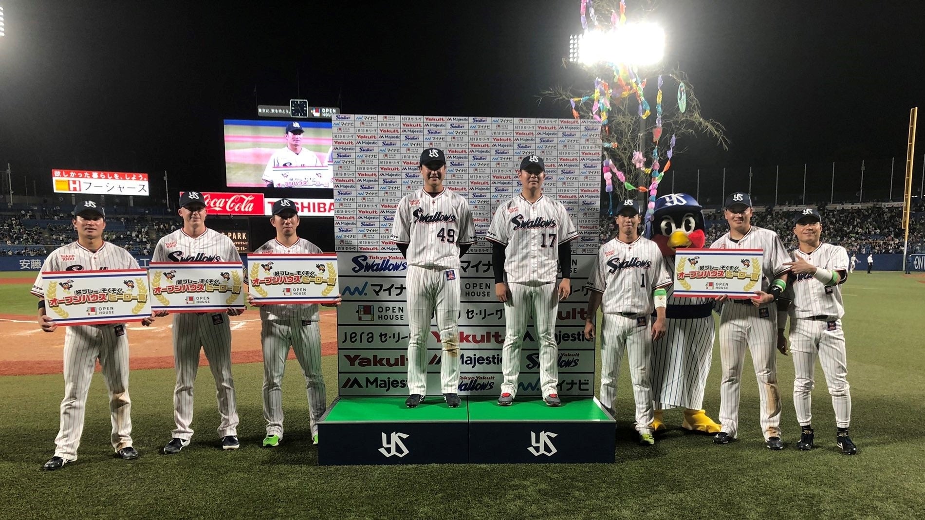 神宮球場での勝利試合において、ヒーローインタビューに選ばれた選手へ金一封を贈呈する「オープンハウス・ヒーロー賞」。通常は1〜3名の選出ですが、この日勝利した場合には最大9人のヒーローを選出いたします。