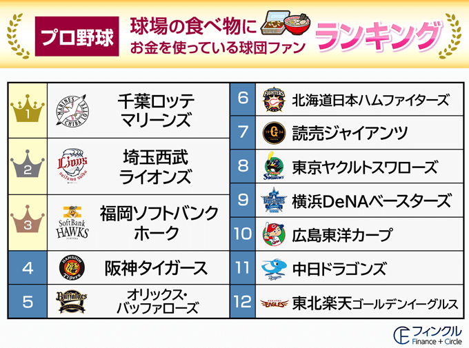 アンケートの結果、1人当たり野球観戦時に、食べ物にお金を使っている球団ファンのランキングは、以下のとおりになりました。