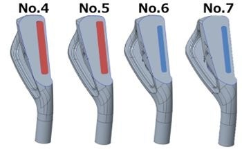 フェース部は、前作※4よりも0.3mm※5薄肉に設計することにより反発性能を向上しました。また、飛距離性能、やさしさ、飛距離ピッチを追求するために、キャビティの後ろ側に番手別にスロット設計をしています。No.4,No.5は高弾道な打球を打ちやすくするために幅を広く、No.6,No.7は操作性をよくするために幅を狭く、No.8~GWは打感をよくするためにスロットを無加工にしました。
