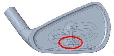 フェース部は、中心部を厚く、周辺部をさらに薄くすることにより、フェースのたわみを増幅させるミズノ独自のフェース肉厚設計『新コアテックフェース』を採用することにより、ミズノ鍛造アイアン史上最高反発係数を達成しています(『新コアテックフェース』は図の赤丸部)。