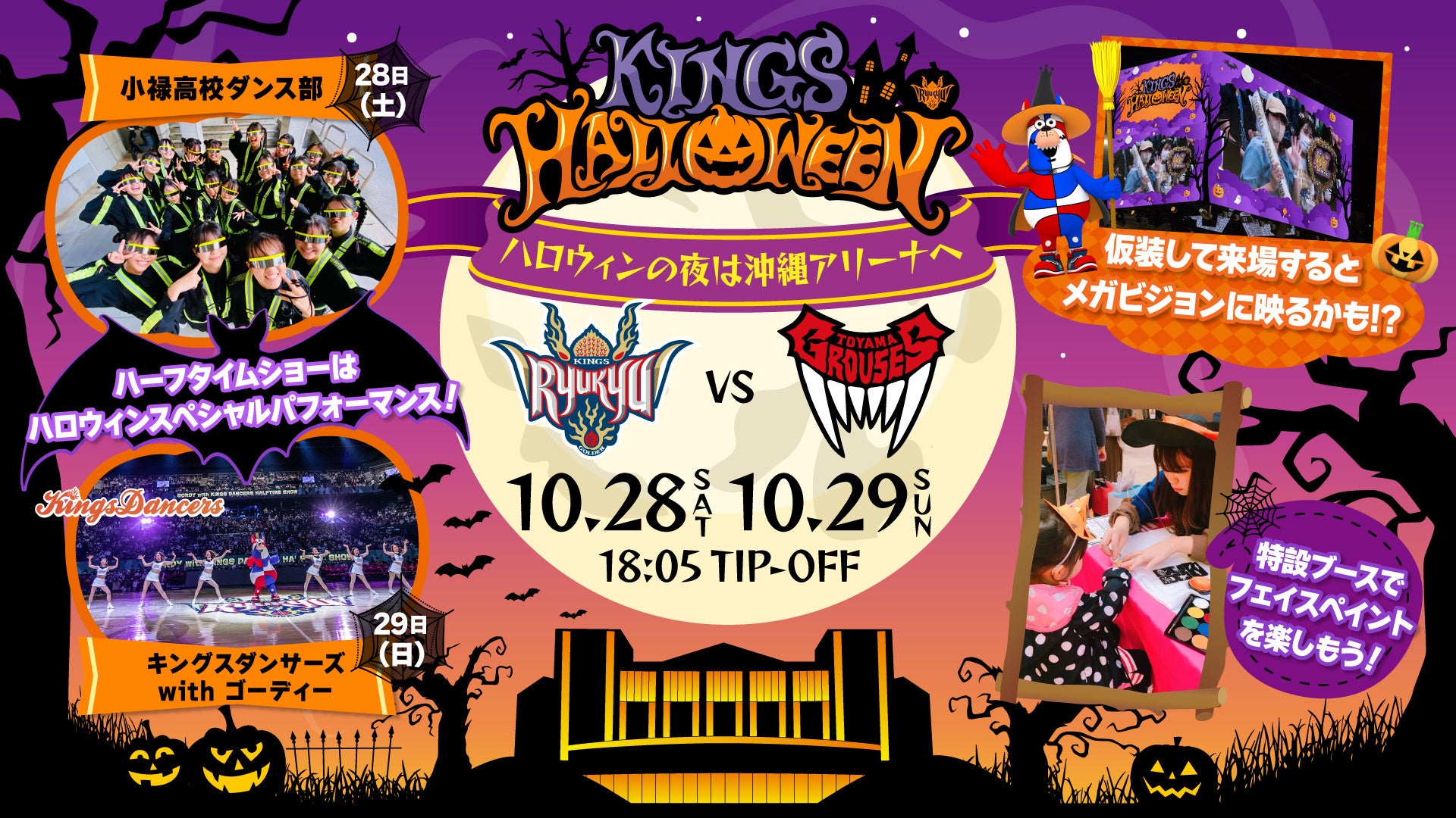 富山戦は「KINGS Halloween」を開催!ハロウィン仕様の沖縄アリーナで、キングスダンサーズとゴーディーによるハロウィンオリジナルダンスショーや、フェイスペイントが楽しめるブースが登場します。会場に足を運び、いつもと違った沖縄アリーナをお楽しみください!