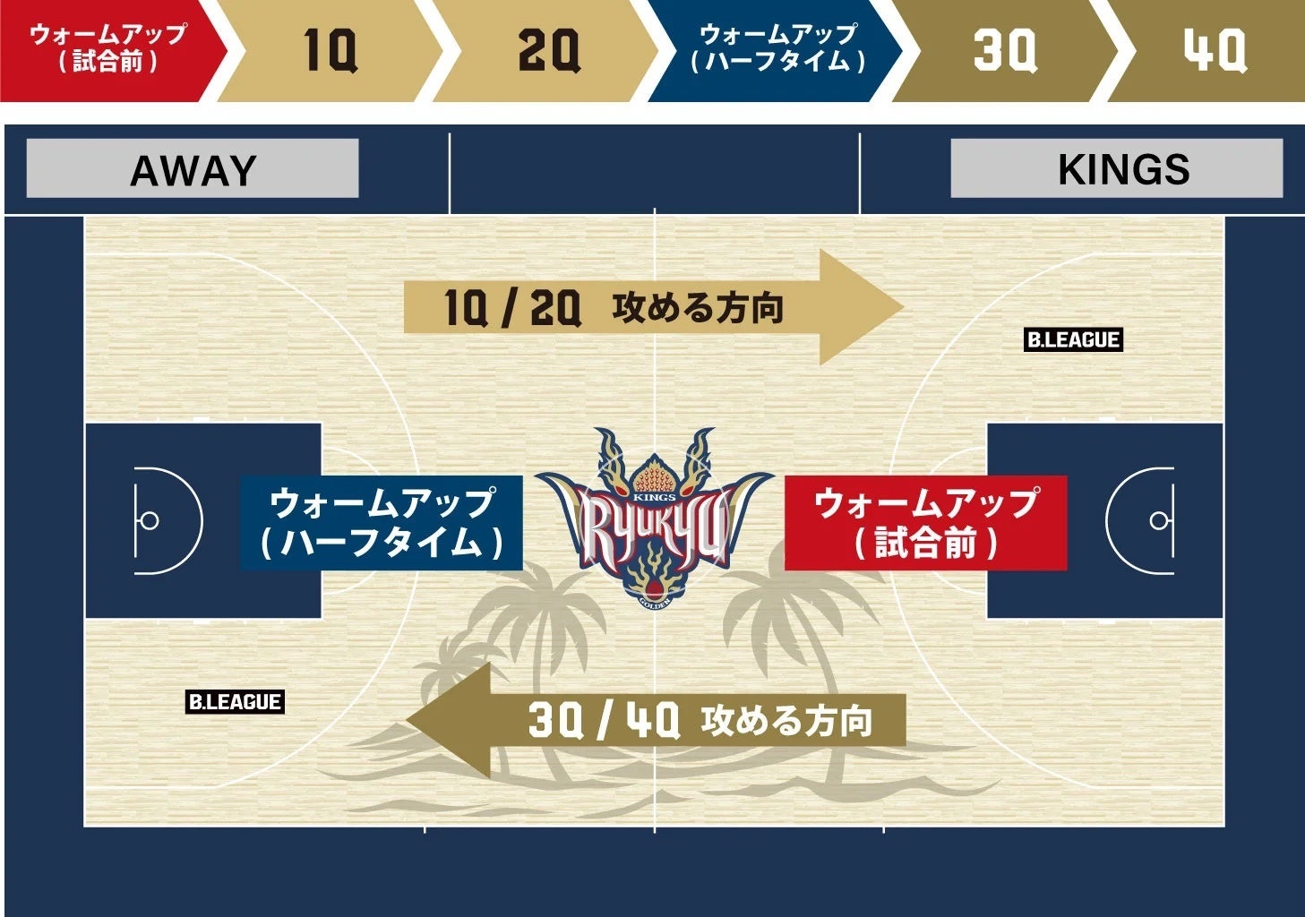 2023-24シーズンより、前半・後半の攻める方向およびコート上でのウォームアップのエリアが変更となります。チケット購入時には、下記の変更点をご確認の上、ご購入ください。