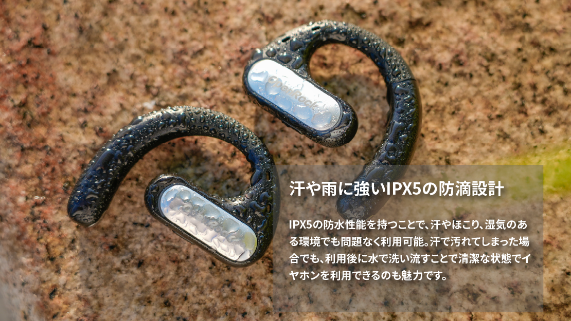 IPX5の防水性能を持つことで、汗やほこり、湿気のある環境でも問題なく利用可能。OpenRock Proはスポーツやフィットネス、ランニングの際の最適なトレーニングの相棒になるはず。汗で汚れてしまった場合でも、利用後に水で洗い流すことで清潔な状態でイヤホンを利用できるのも魅力です。