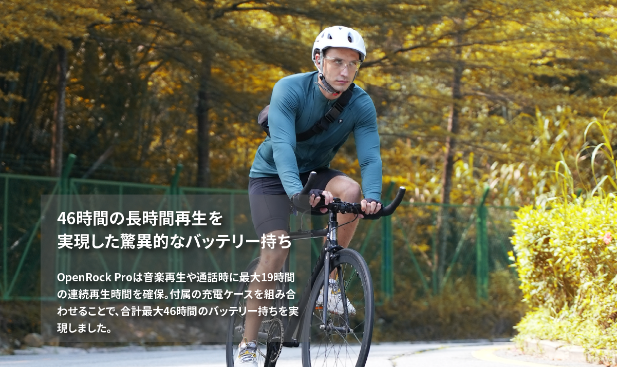 OpenRock Proは100mAhの大容量バッテリーを搭載。音楽再生や通話時に最大19時間の連続再生時間を確保しています。(70%の音量での再生時)付属の充電ケースを組み合わせることで、合計最大46時間のバッテリー持ちを実現。また、わずか5分の充電で1時間の再生が可能な急速充電機能も搭載しています。