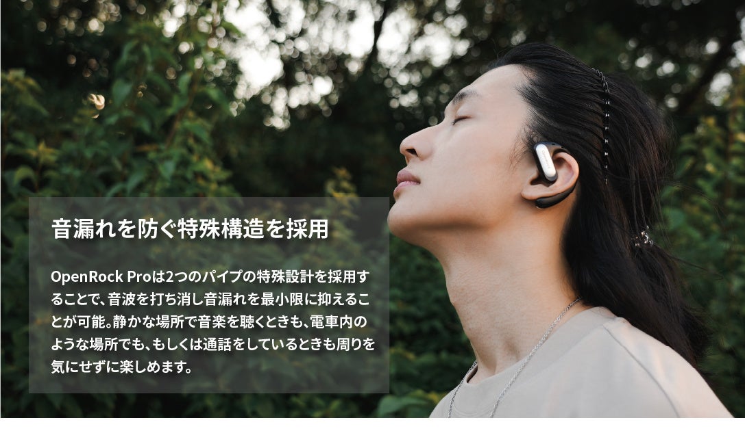 OpenRock Proは2つのパイプの特殊設計を採用することで、音波を打ち消し音漏れを最小限に抑えることが可能。静かな場所で音楽を聴くときも、電車内のような場所でも、もしくは通話をしているときも周りを気にせずに楽しめます。