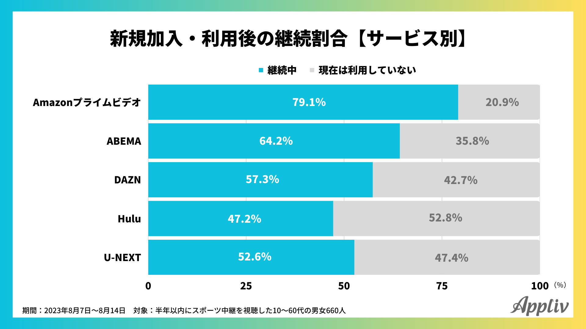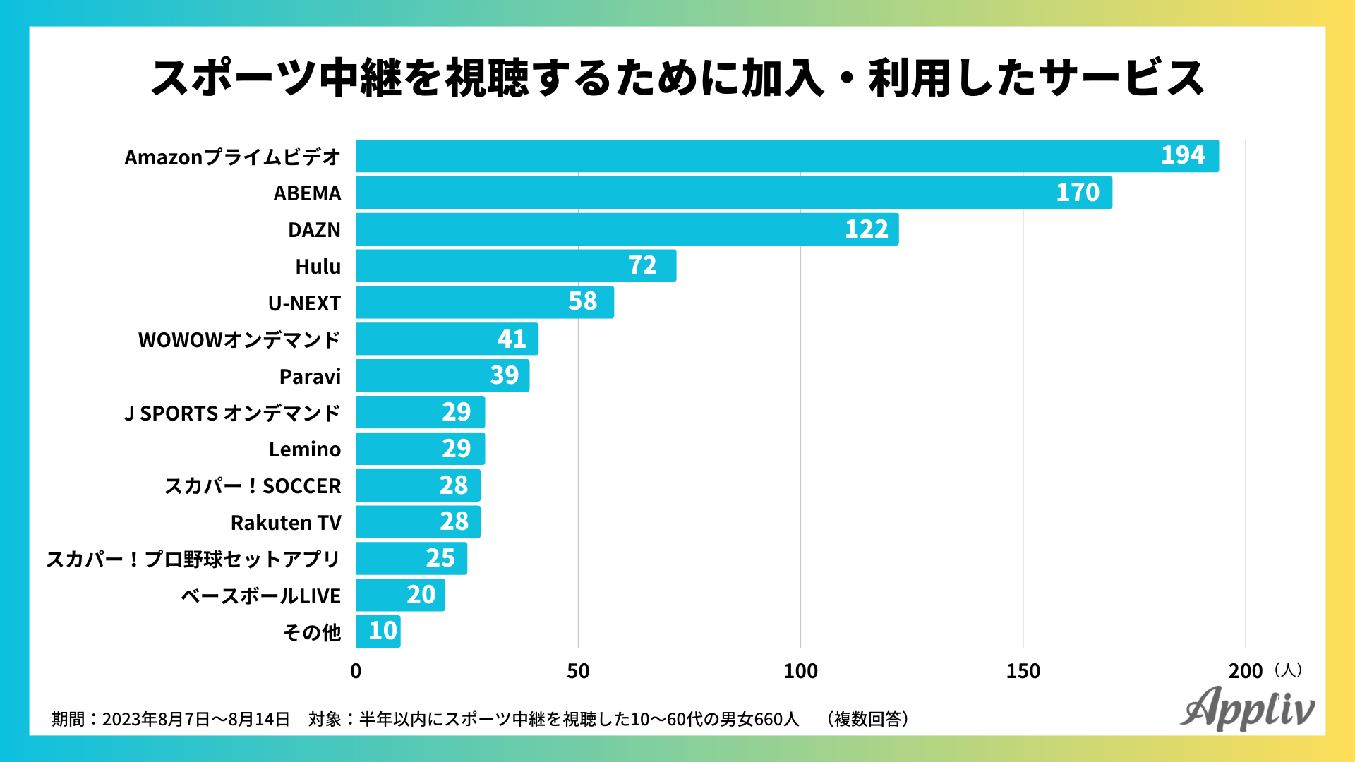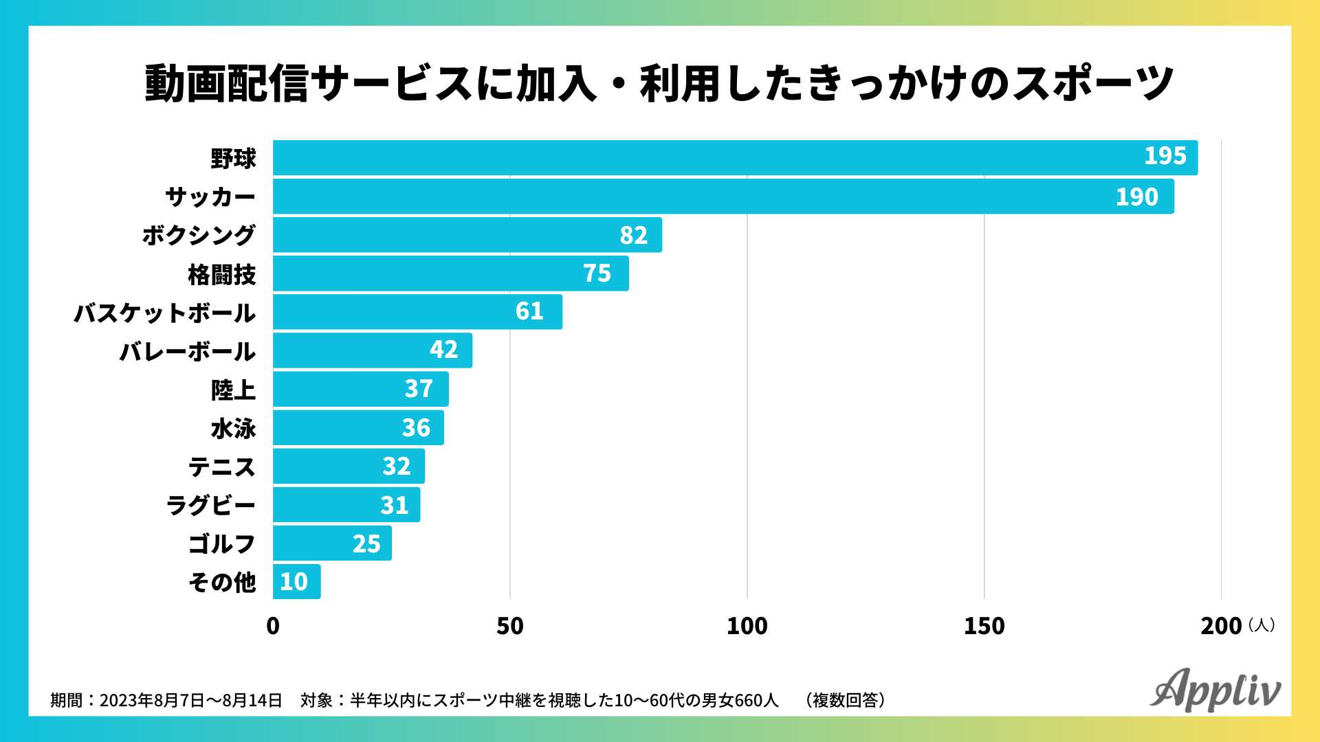 Applivでは、スポーツ中継と動画配信サービスに関するアンケートを実施。スポーツ観戦を目的に動画配信サービスに新規加入・利用した割合や、そのきっかけ、視聴するデバイスの種類、継続状況など、調査結果を発表します。