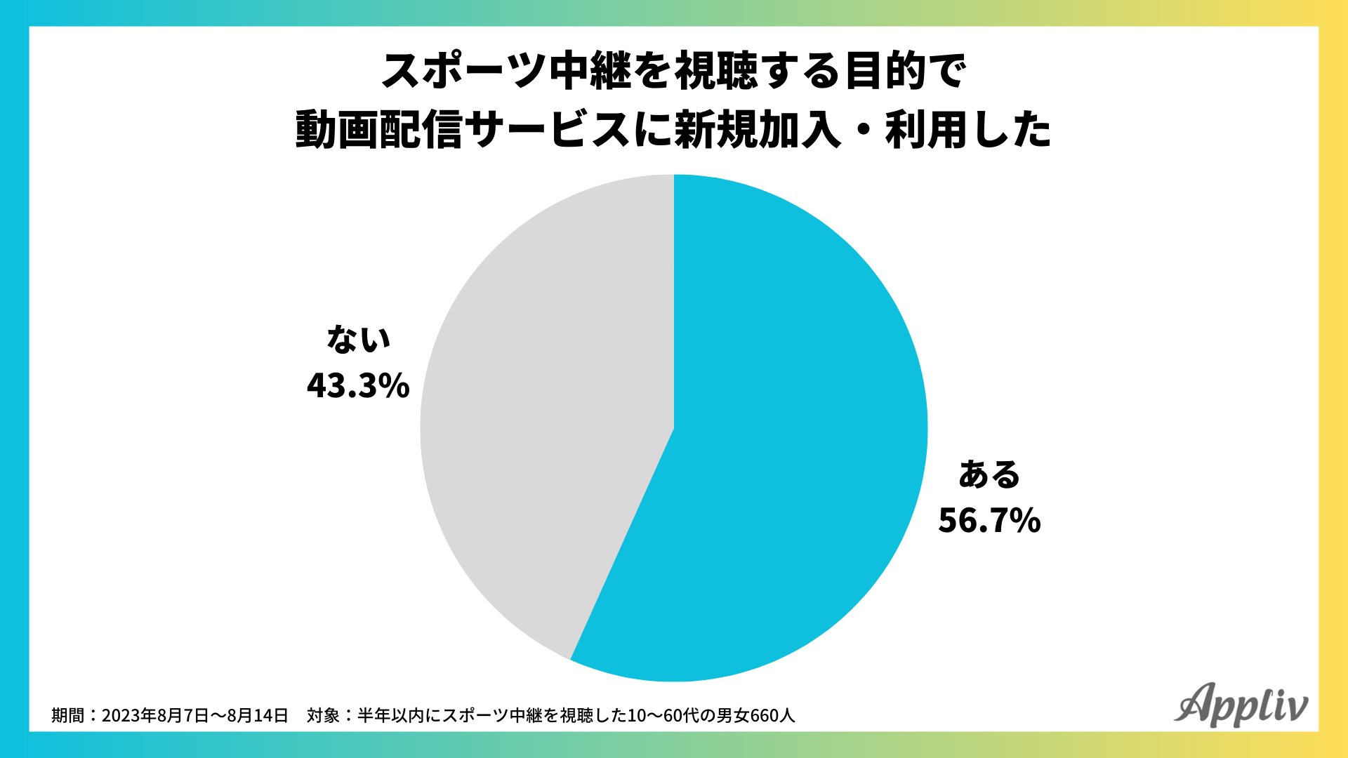 半年以内にスポーツ中継を視聴した10代~60代男女660人を対象に、スポーツ中継を視聴する目的で動画サービスに新規加入・利用した経験をたずねた結果、「ある」と回答したのは全体の56.7%でした。