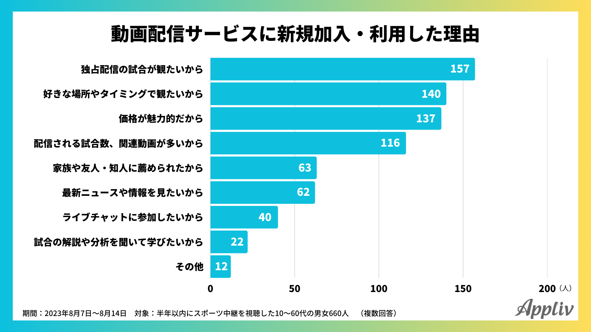 2番目は「自分の好きな場所やタイミングでスポーツ観戦したいから(140人)」、3番めは「価格が魅力的だから(137人)」と続きます。動画配信サービスの場合、スマホやPCなどテレビ以外のデバイスで視聴できることも、加入・利用する決め手になっていると考えられます。