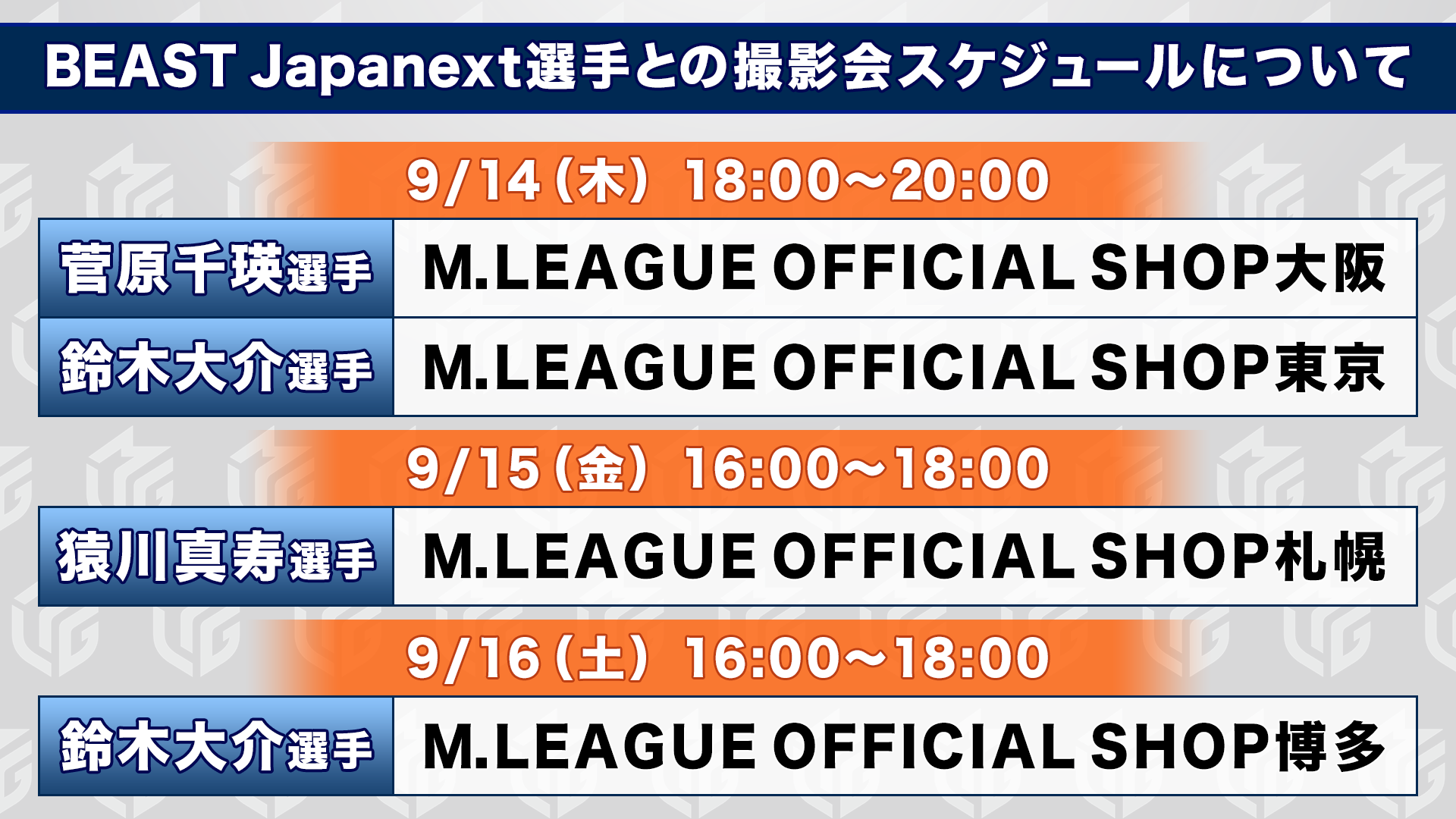 さらに、今シーズンより新たに加入するチーム「BEAST Japanext」の新グッズ販売を記念した特典会を「M.LEAGUE OFFICIAL SHOP」全国4店舗にて実施いたします。ぜひこの機会に「M.LEAGUE OFFICIAL SHOP」に足をお運びください。