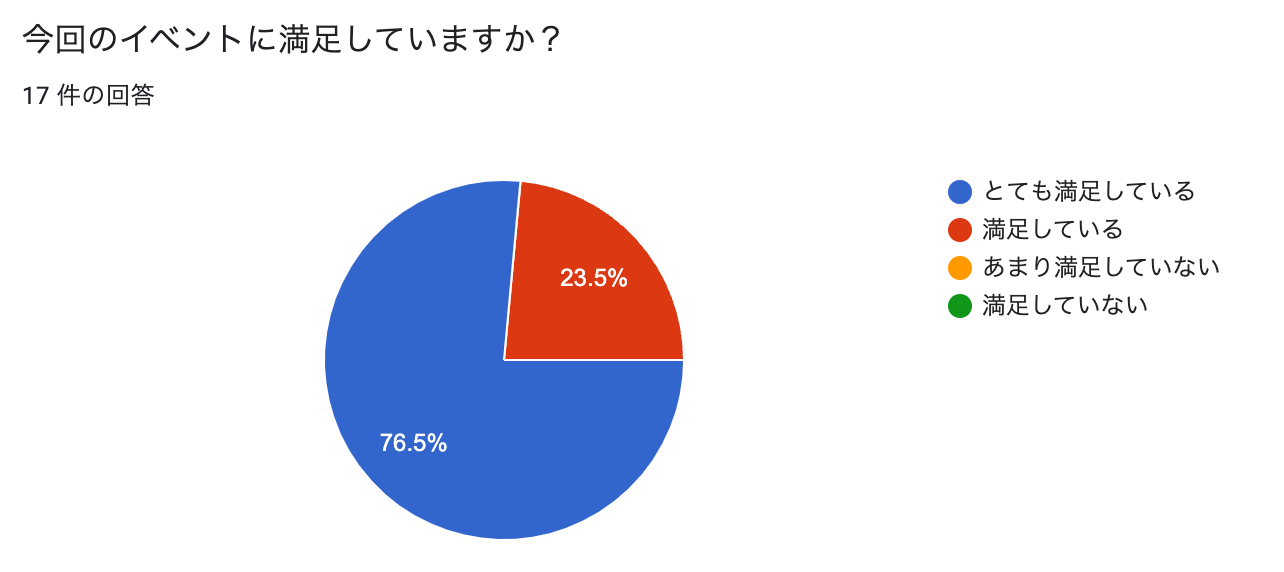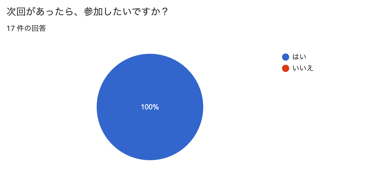 また、アンケート(※)を実施したところ、満足度は100%、「次回があったら参加したいか」の設問にも100%の方が「はい」と回答しました。