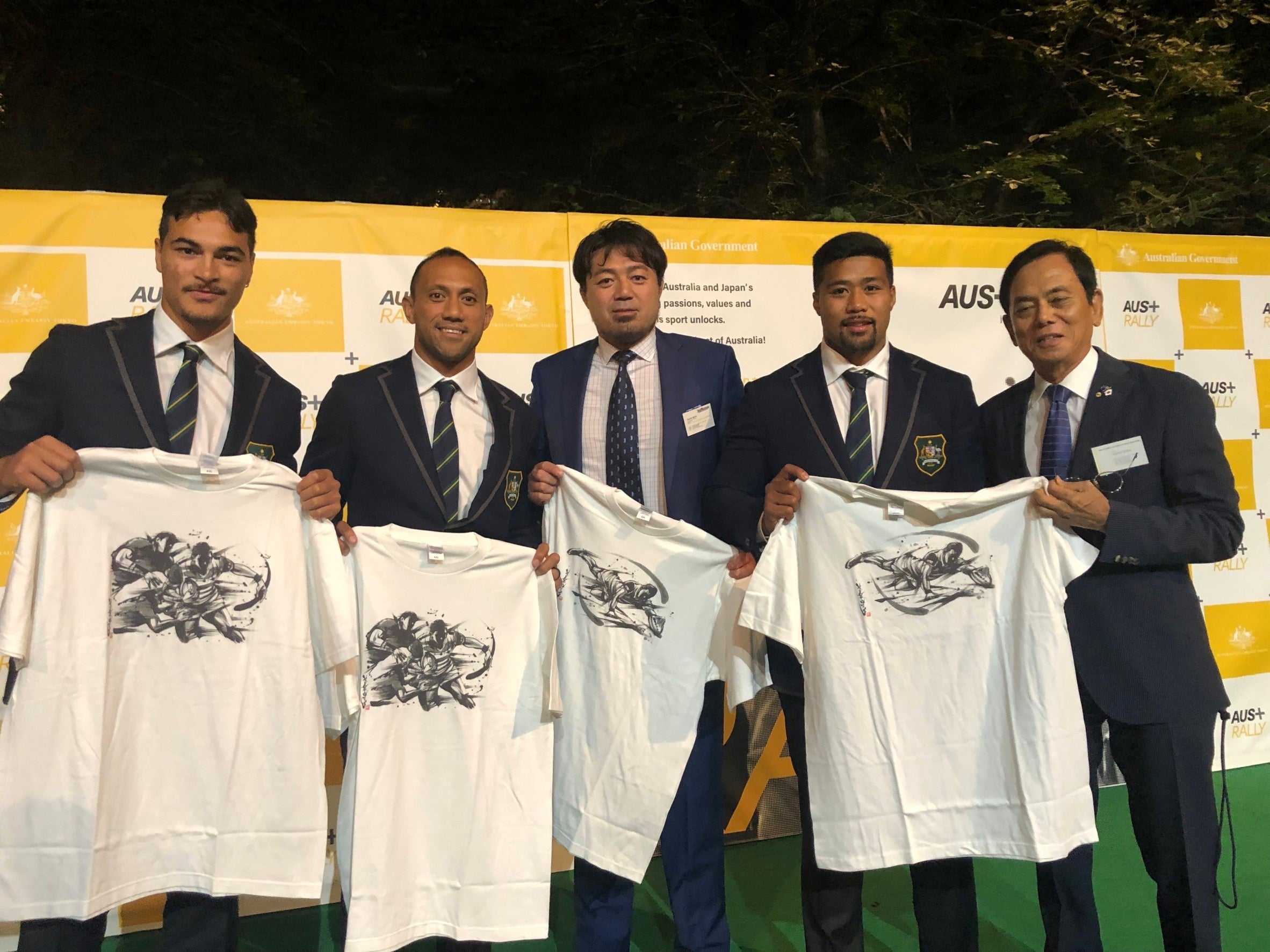 オーストラリア代表に茂本氏の作品グッズを渡す元日本代表主将 箕内 拓郎氏