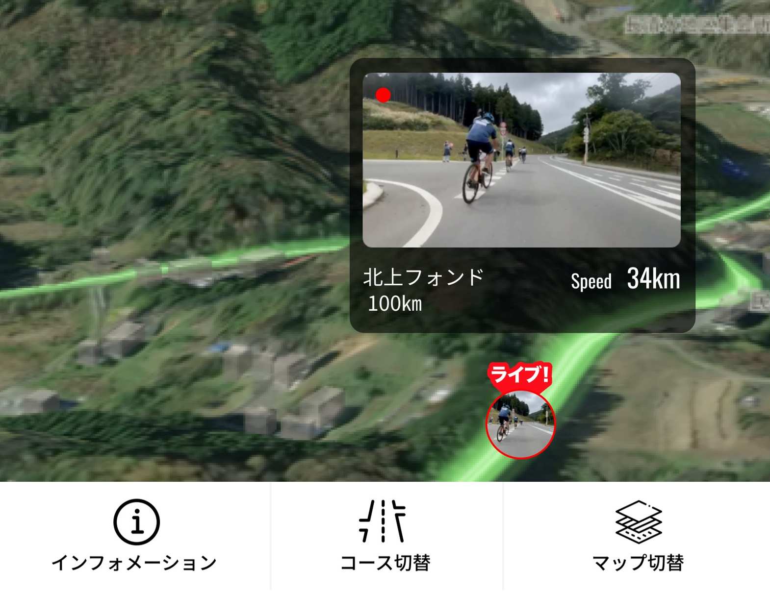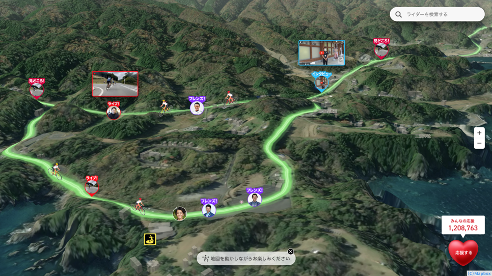 ・応援したいライダーを検索することで、そのライダーが「今どこにいるか、どこをどのように走ってきたのか」を見ながら、遠隔で応援することが可能です。また、Mapbox社のライダー車載カメラで撮影されたライブ映像により、 スタートやゴールのダイナミックな瞬間や見晴らしのいいコースを見ることができるため、スピード感や風景の素晴らしさを応援しながら追体験できます。