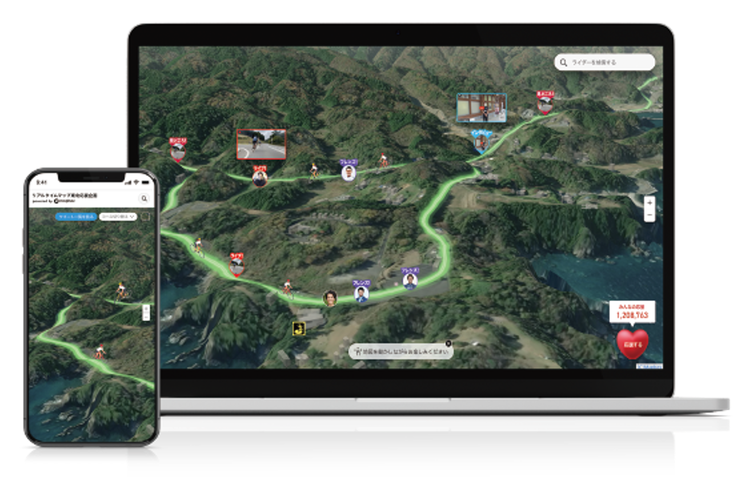 ・画面右下の応援ボタンを連打すると、デジタルマップ上に花火のアニメーションが表示されます。また、X(旧Twitter)でライダーに向けた応援メッセージを投稿すると、ライダーの見ているデジタルマップ上に直接メッセージが表示されます。ライダーへダイレクトに応援を届けることができる ため、イベントへの参加感を味わえます。