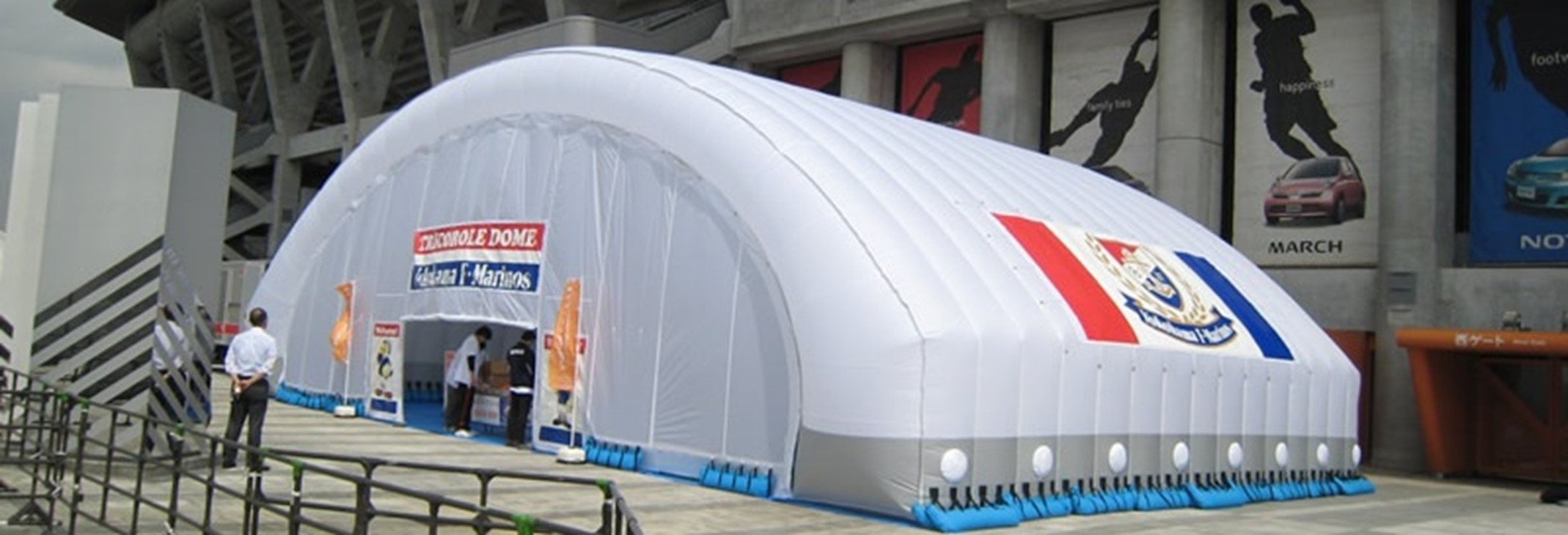特別な空気膜構造でありながら軽量・コンパクトに設営でき、風を送って10分以内に完成
