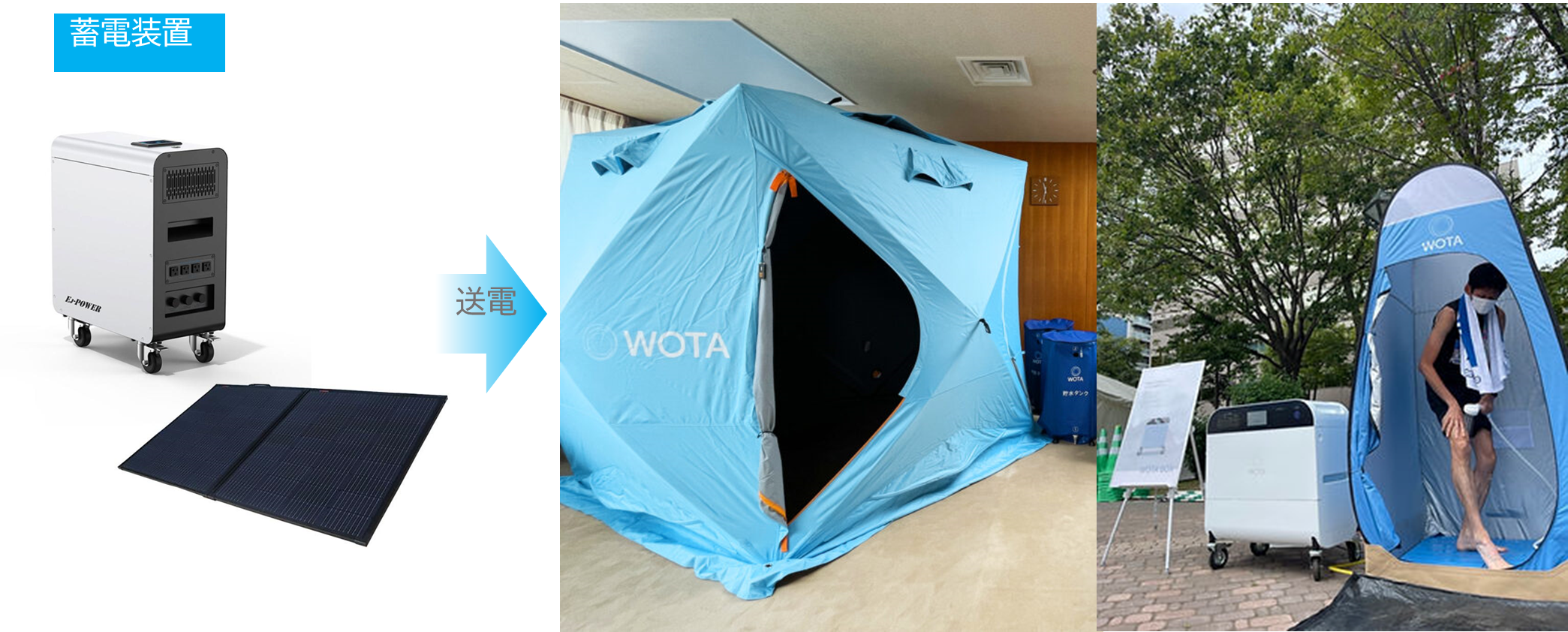 水循環型仮設シャワー/水循環型手洗い場/蓄電装置/温冷水使用可