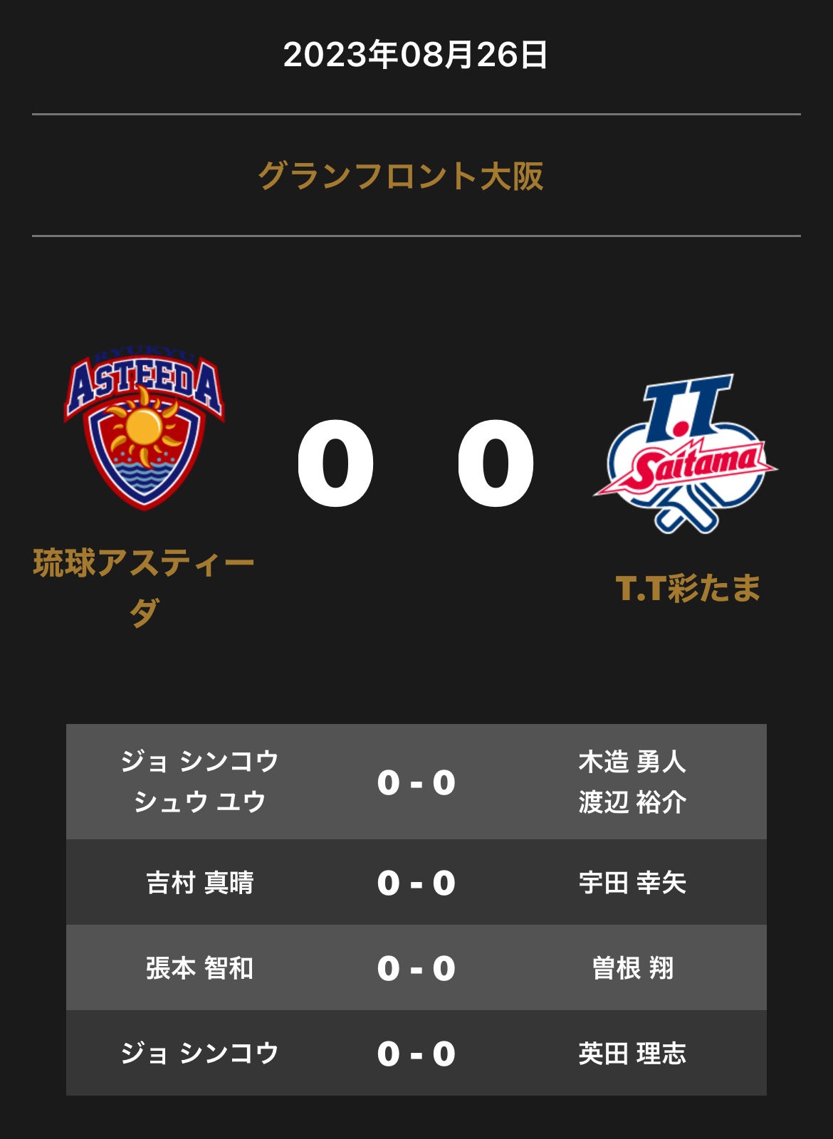 ホームプレスリリース ノジマTリーグ2023-2024シーズン公式戦 8月26日(土)12:00試合開始 琉球アスティーダ vs T.T彩たま 対戦オーダー発表 2023年08月26日 11時06分 公開|スポーツマニア編集部プレスリリース 一般社団法人Tリーグのプレスリリース ノジマTリーグ2023-2024シーズン公式戦 8月26日(土)12:00試合開始 グランフロント大阪にて開催の 琉球アスティーダ vs T.T彩たまの対戦オーダーが発表されました。