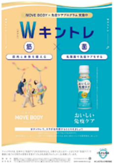 本年8月、キリンビバレッジ株式会社(本社:東京都中野区、代表取締役社長:吉村透留)と連携し、ティップネスのオリジナルプログラム「MOVEBODY」プログラム参加者に、免疫機能維持に役立つことが報告されているプラズマ乳酸菌を1000億個配合したペットボトル飲料「キリンおいしい免疫ケア」(機能性表示食品)をプレゼントし、“筋”肉を鍛えて乳酸“菌”も取り入れる「(筋&菌の)Wキントレ」を提唱した。