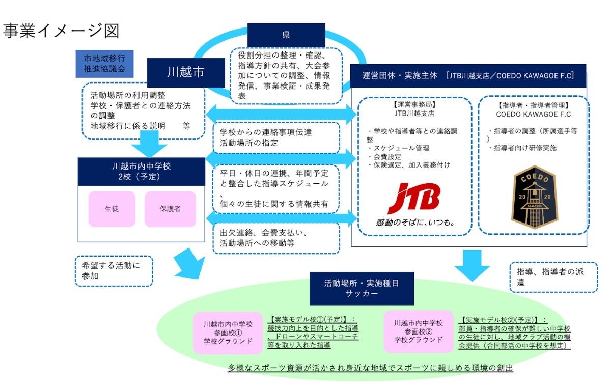 2、学校行事と関連の深いビジネスを展開しているJTB様が運営事務局となり学校・生徒側や地域クラブ・指導員のニーズ・課題を把握することにより今後の地域クラブ活動の体制整備を川越市内外で推進する機会とする