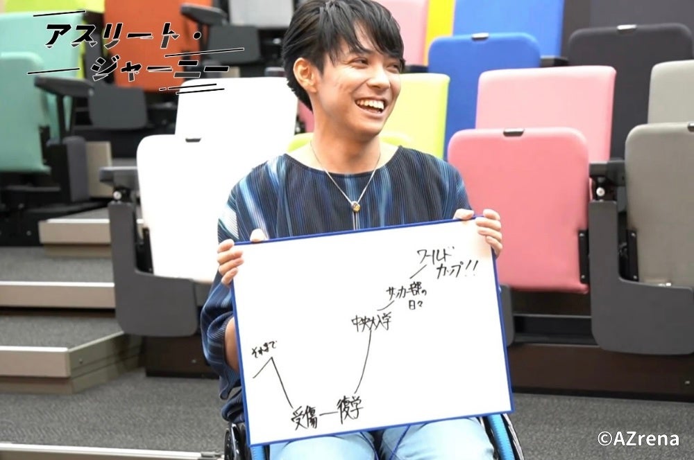 中央大学サッカー部で営業部として活動する持田温紀(もちだ・はるき)さんは、高校生のときに交通事故に遭い、現在は車いすを使って生活しています。自慢の足が動かなくなった失意のなか、彼を救ったのはスポーツの力でした。対談のMCは、フリーアナウンサー・原大吾さん(写真右)が務めています。